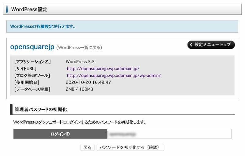 - WordPressのダッシュボードにログインするためのログインIDが表示されていますので、そのまま「パスワードを初期化する」をクリック
