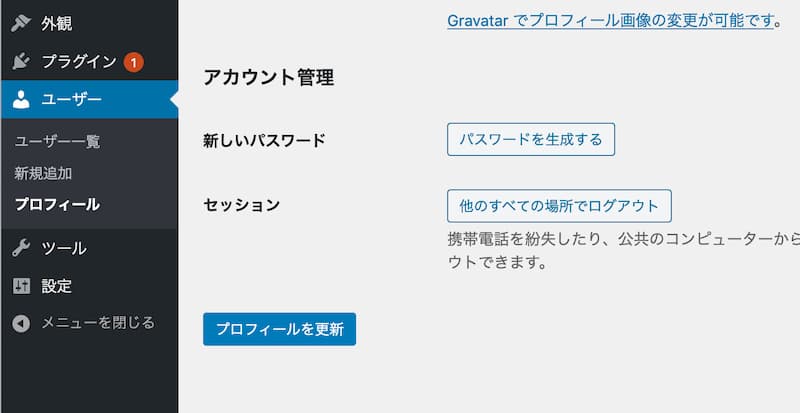 - 自動生成されたパスワードが表示されますが、これをあなたの好みの文字列に書き換えて「プロフィールを更新」して下さい。
