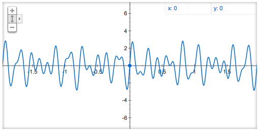楽器の音(シングルノート)は、基本周波数の f に加えて複数の倍音が同時に鳴ることで、その楽器特有の音色をつくっています。倍音の混ざり方で音色がかわることを波形で見てみましょう。以下、Googleのグラフ機能を使ったものです。表示倍率がそれぞれ異なっていますが、横軸xの値が 0〜1 の間でちょうど1回振動、つまり基本周波数は1であることがわかると思います。