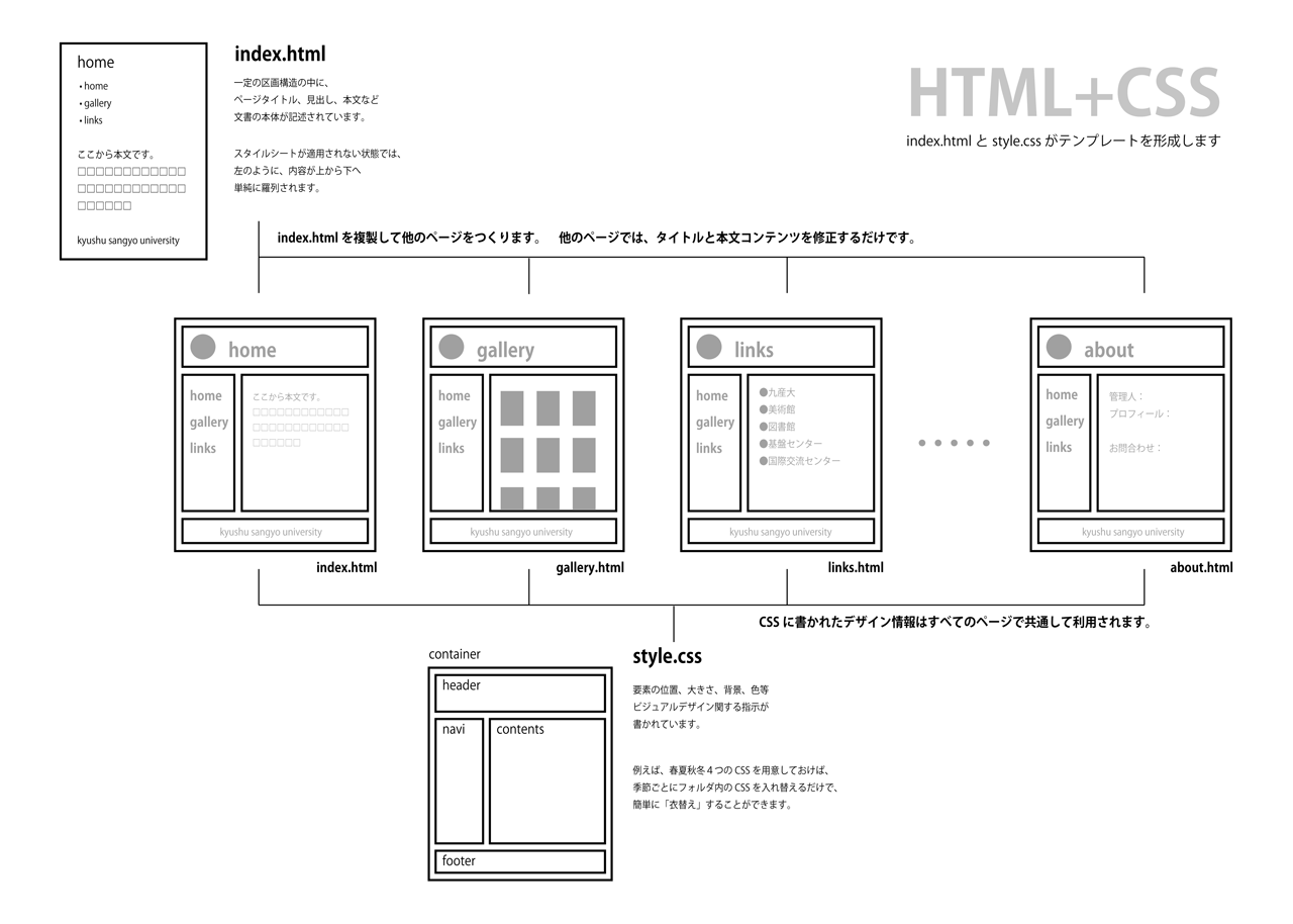 一般に、Webサイトをデザインする際は、閲覧者を混乱させないよう、サイトのロゴ、一貫したナビゲーションを含め、サイト内のすべてのページで、レイアウトが統一されていることが必要です。そのため、以下のコーディング作業を行って、全ページの基礎となる「テンプレート(ページの雛形)」を制作します。