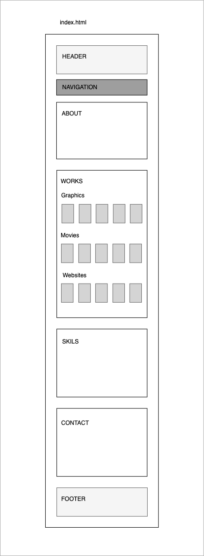 index.html を以下のようにセクションで区切って縦一列で作ると同時に、個々の作品を独立した別の htmlページとして作成します。メインのページと作品個別ページのテンプレートを別のものとして制作します( style.css , work.css )。