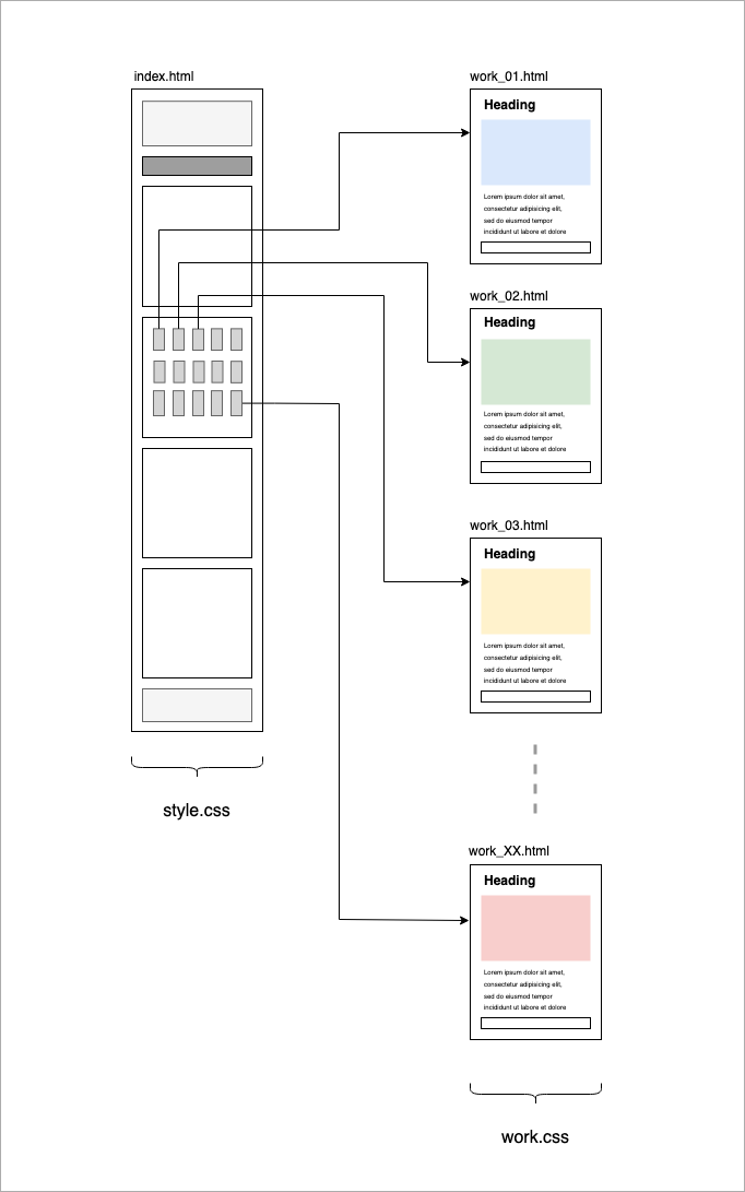 トップページあるいは、ギャラリーページに作品の一覧サムネイルがあって、サムネイルのクリックで、個別作品のページにジャンプする・・というかたちでデザインしたい場合は、以下のように標準テンプレート(style.css)と作品個別ページのテンプレート(work.css)を別のものとして制作します。