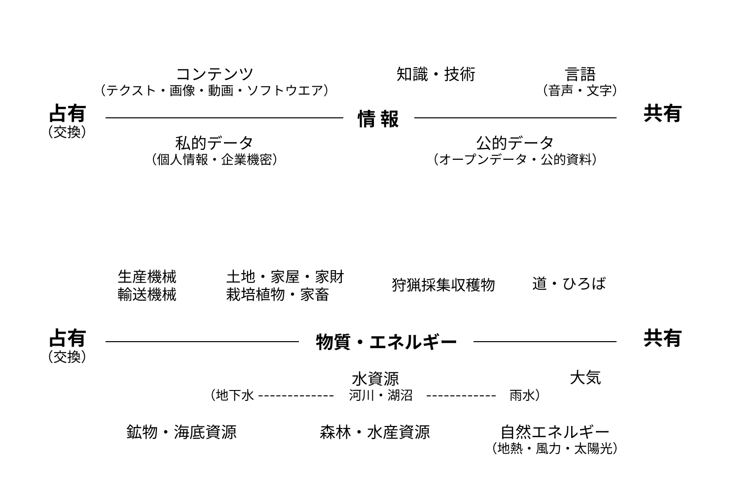 社会の経済体制によって異なるが、我々をとりまく物質・エネルギー・情報は、いずれも「占有」と「共有」の両極間に位置付けられる。現在大半の国家が採用している資本主義経済体制では、「囲い込み」が可能な物質・エネルギー資源は富として占有されるとともに、貨幣という情報体を介した商品交換の対象となっている。同様に情報も法的権利にもとづく囲い込みによって、知的財産として占有・交換されている。一方で、大気・水・自然エネルギーなどの囲い込みに適さない資源や、占有権が主張されない情報は、コモンズとして共有されている。