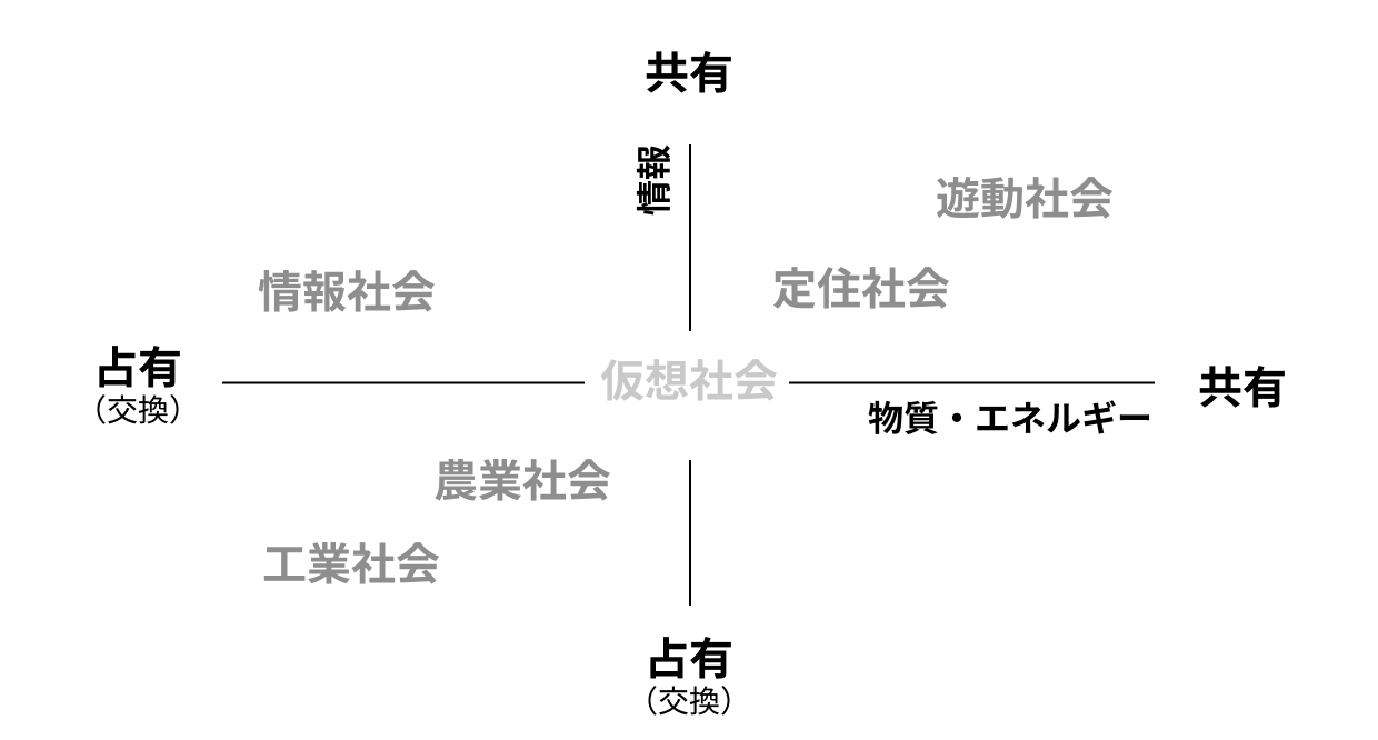 各時代の社会は、情報共有を縦軸、物質・エネルギーの共有を横軸とすると、右図のように配置できる。なお仮想社会では、物質・エネルギーへの 依存はなく、情報の扱いは「オーナー」の考え方次第で決まる。