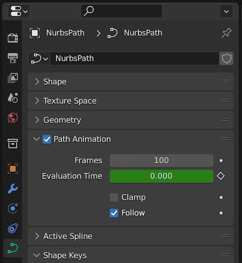 プロパティーエディタ > Object Data Property パネル > Path Animation の項目で、以下のような各種調整が可能です。