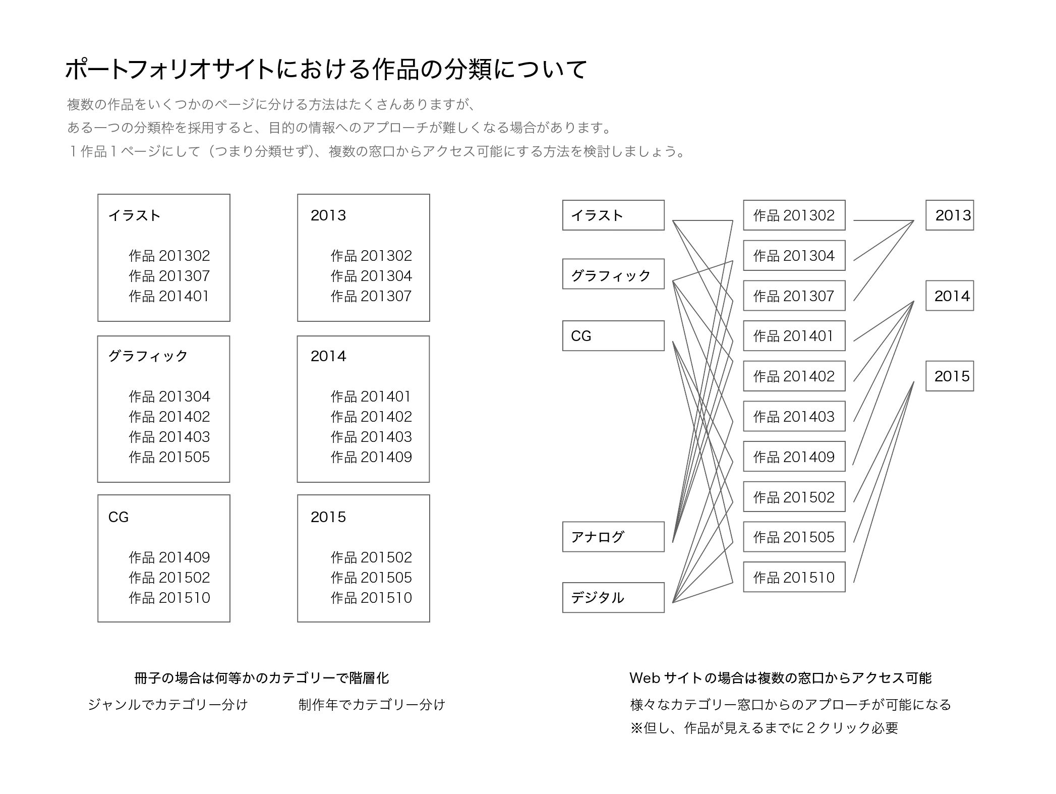 紙のポートフォリオの場合は、イラスト / グラフィック / Web / 映像 などと作品のジャンル別に整理するのが一般的です。