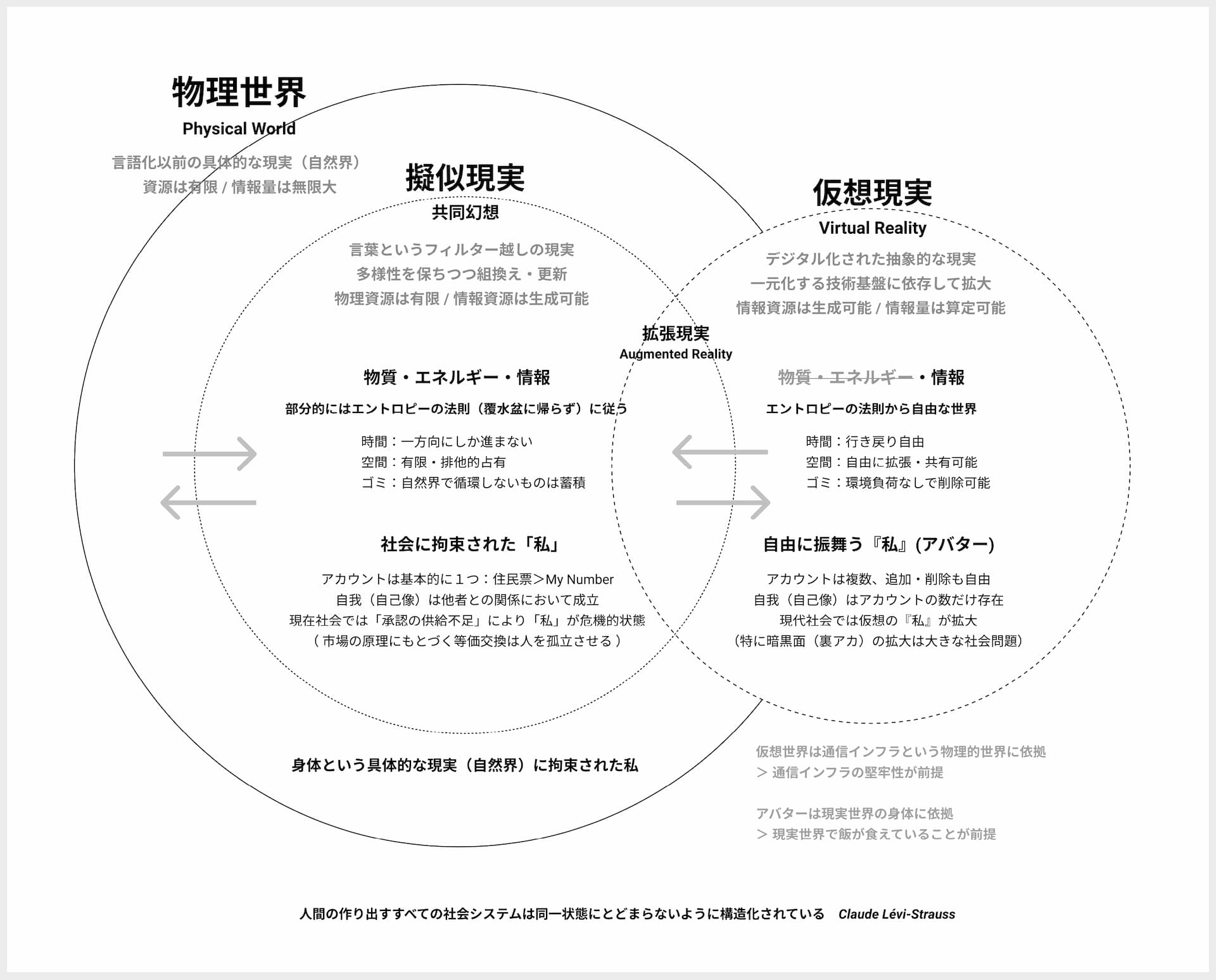 リアルな環境の中にリアルな「私」が存在するとともに、スマートフォンやスマートグラス等の端末上の視聴覚情報が拡張的に「上書き」された空間