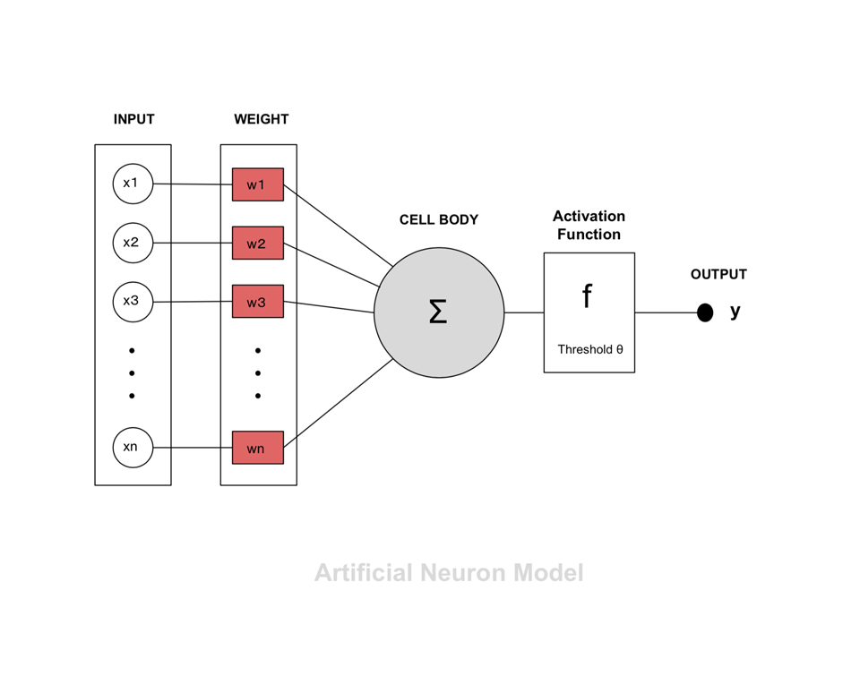 人間の脳の中にはニューロンという神経細胞が約千億個あり、各ニューロンがシナプスと呼ばれる接合部位によって繋がっています。ニューロンは入力される電気信号の総和がある一定の量を超えると発火し、次のニューロンに電気信号を出力します。