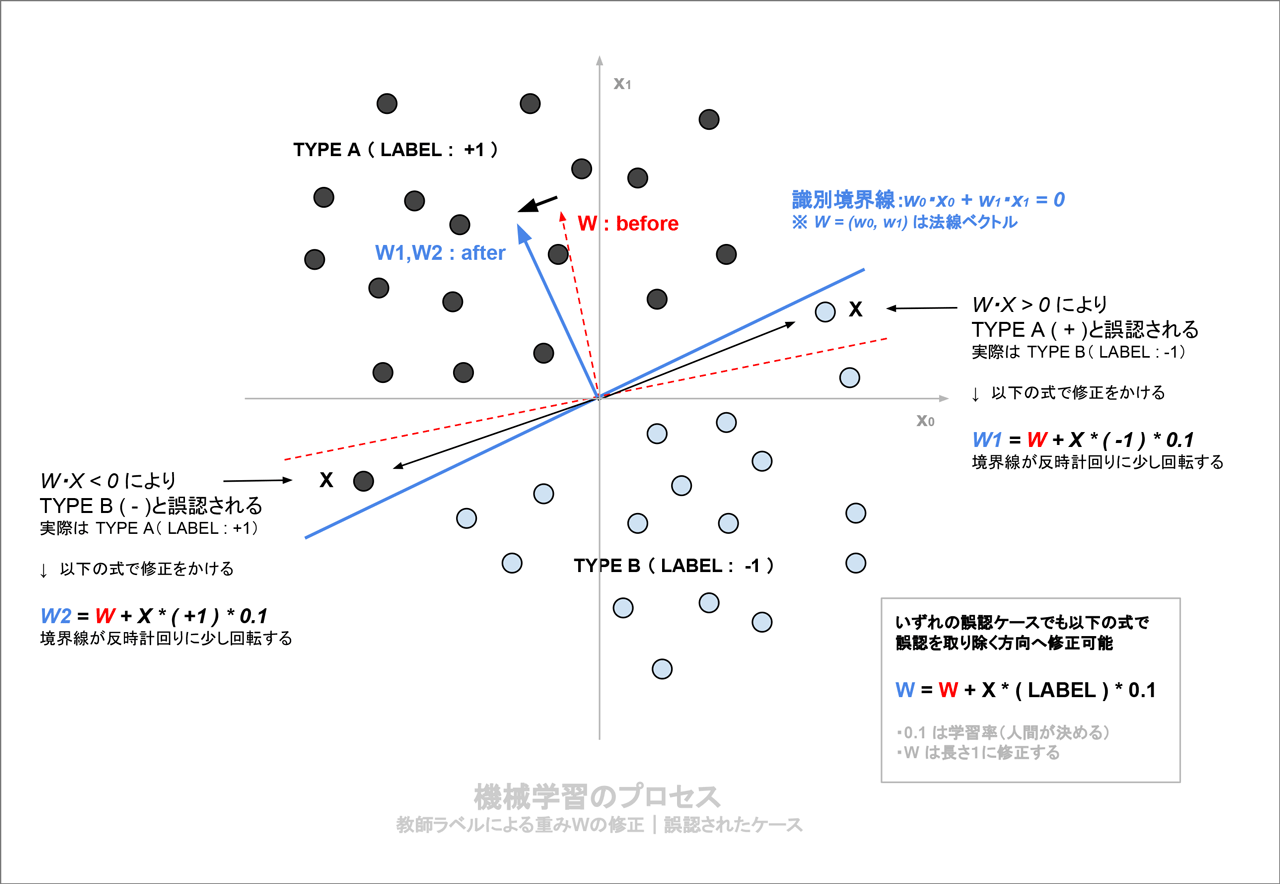 (x0,x1)と法線ベクトルの内積 = w0・x0 + w1・x1 を計算すると同時に、それを正解ラベル( 1:TYPE A , -1:TYPE B )と照らすと、境界線が正しく2者を分離しているかどうかを判定することができます。