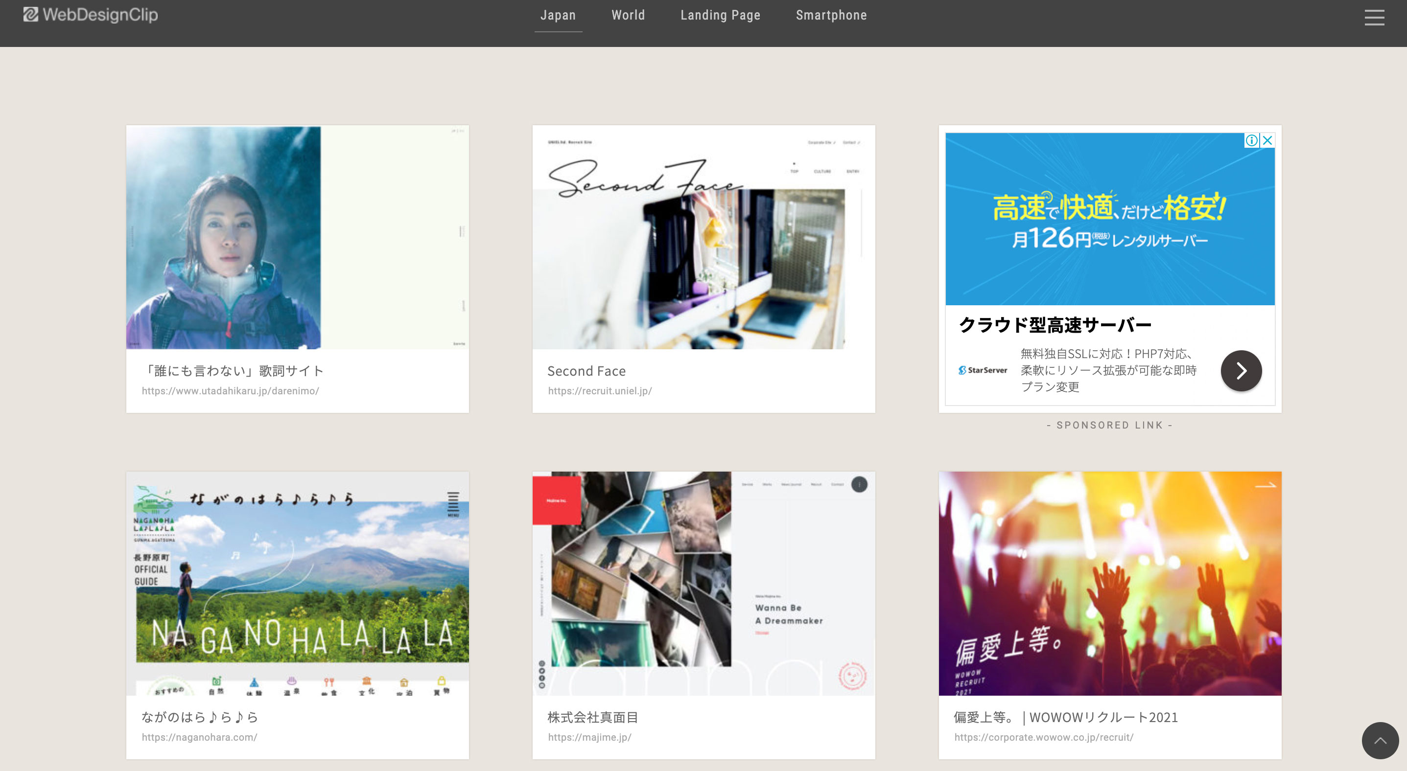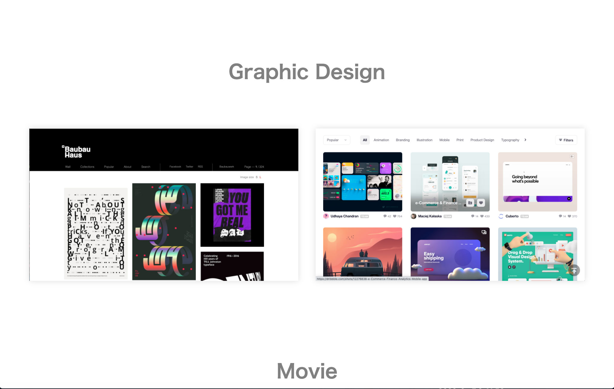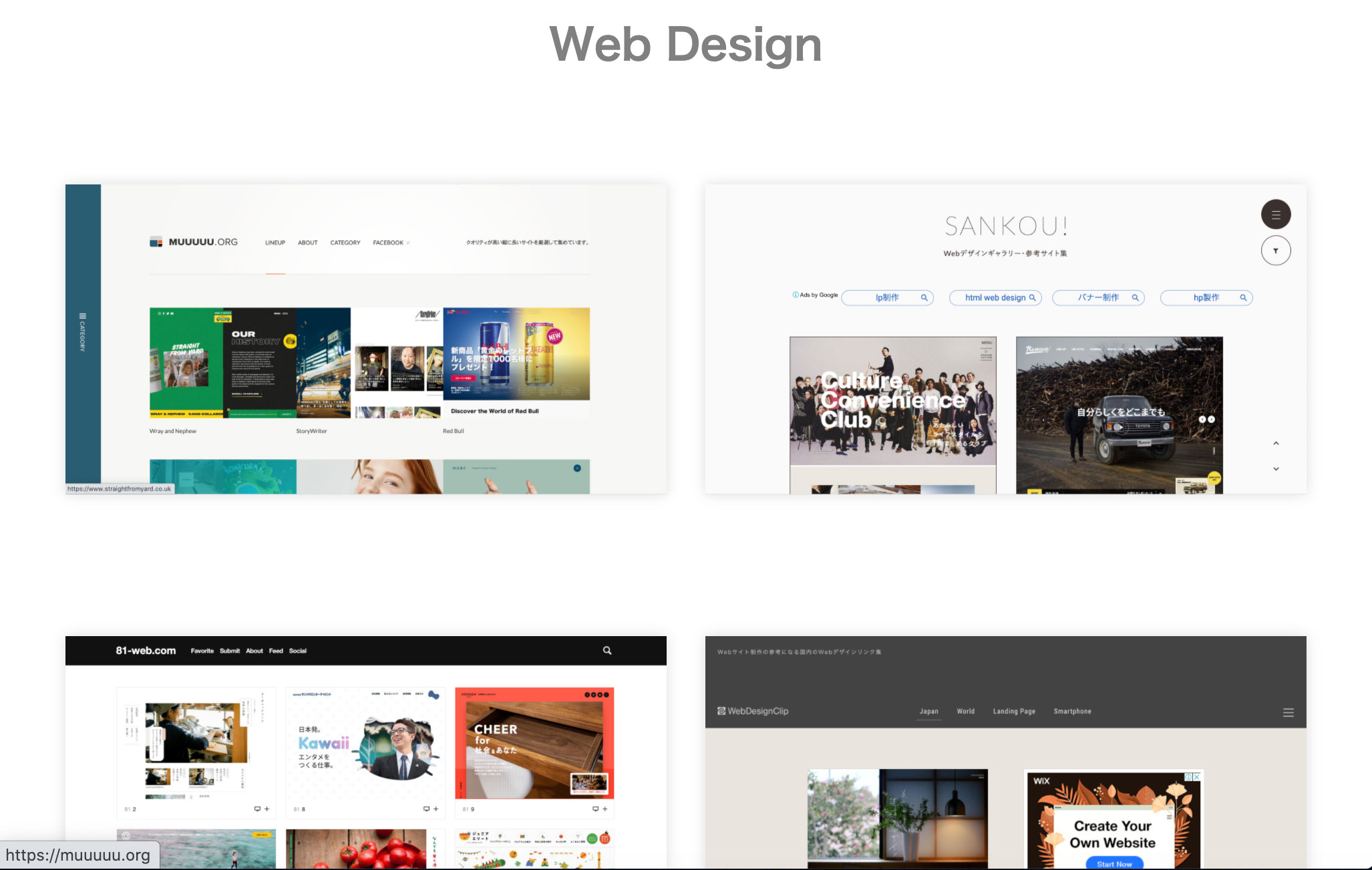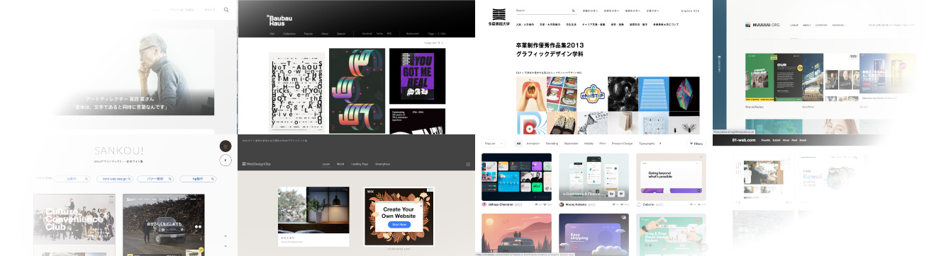 数あるデザインのギャラリーサイトの中でほとんどがwebデザインのみを集めたサイトであったり、グラフィックのみを集めたサイトであったりとジャンル別に分けられているものが多い。そのため、違うジャンルのサイトを見たい時、再検索をかけなければならなかったり、ページを二つに分けて見なければならなかったりとなにかと面倒である。そこでデザインのギャラリーサイトを総合的に扱ったサイトがあれば便利だと思いこのプロジェクトを考案した。また、数々のギャラリーサイトを見たところひとつひとつのコンテンツを大きく表示しクリックしなくてもその作品の全体が見えるよう工夫されておりとても見やすいと感じたため今回のサイトを作るにあたり参考にした。