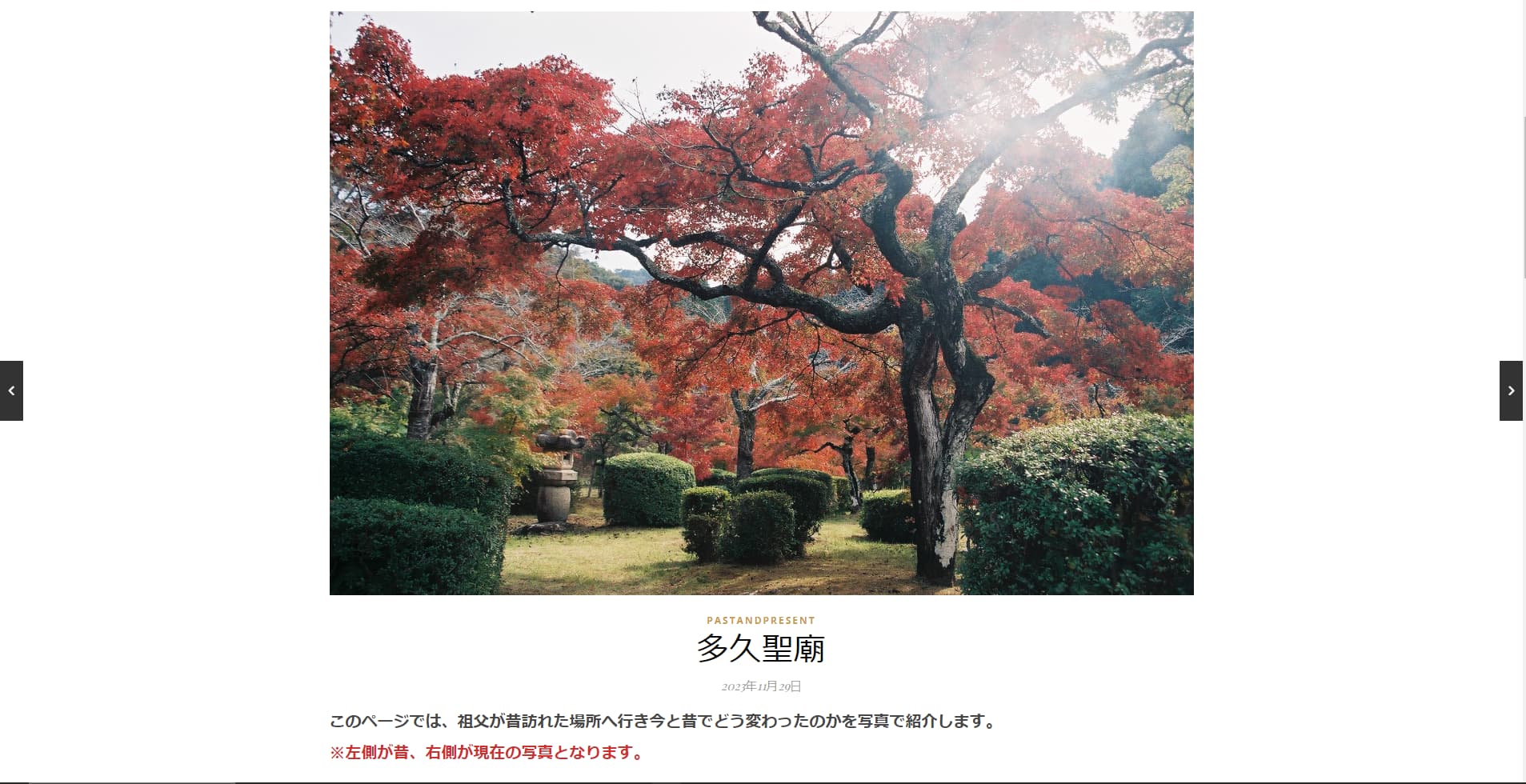 佐賀県に住んでいる祖父が昔訪れた場所へ行き、昔祖父が撮った写真と自分が撮った写真を掲載し、昔と今でどう変わっているのか対比するサイト