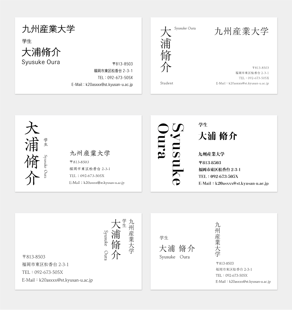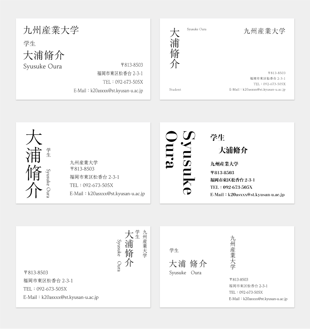 - 名刺のどこの部分を縦書きにしたらいいのか横書きにしたらいいのか、空間はどのくらいあけるべきかなどを参考にしようと思います。