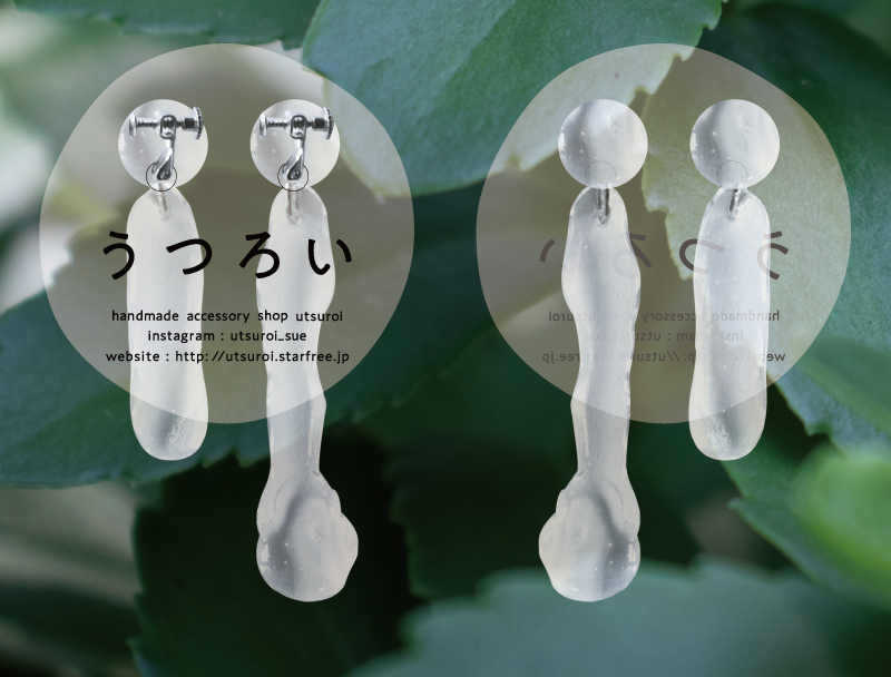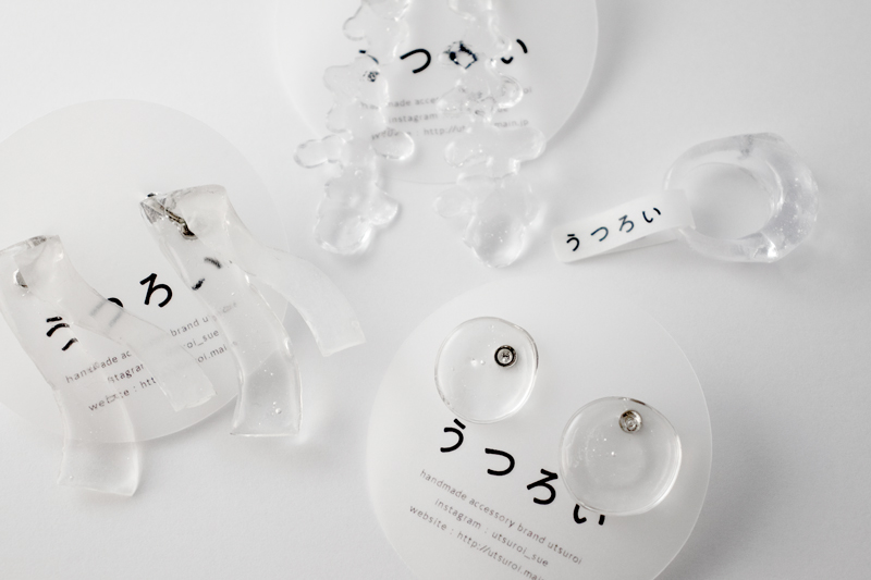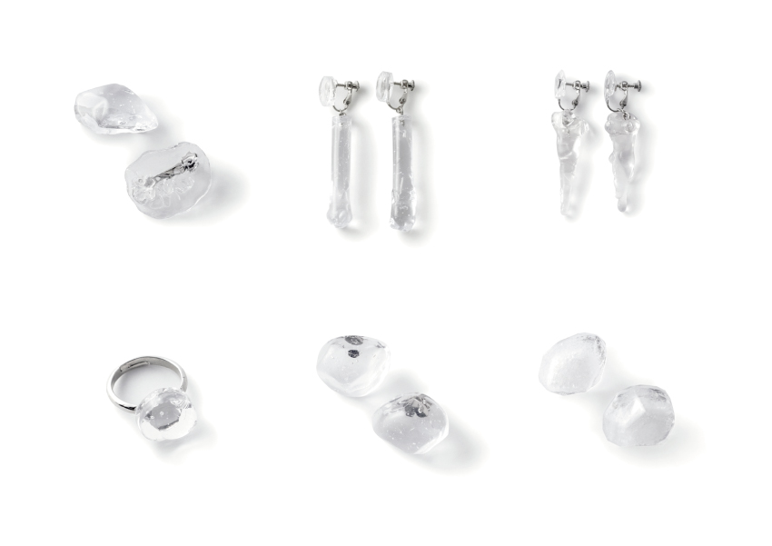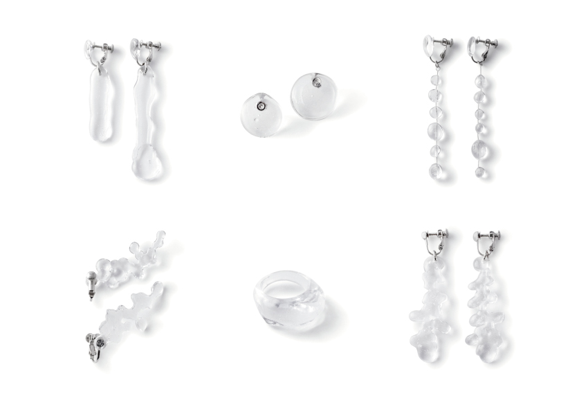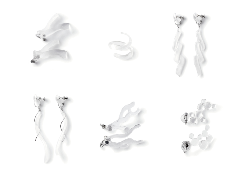大振りなアクセサリーだと個性的に見えるが、色がついていると派手さが増してしまう。さらに、服装によって合わないものも出てくる。そこで、色を使わず無色透明にすることで、個性的な形でも派手さが軽減され、どの服装や雰囲気にも馴染むアクセサリーを考案した。また同じ形をなくすため、パーツはひとつひとつ手作業で制作した。身に付ける人の好みや雰囲気が変化していく姿と、四季が移ろう中で変化していく無色透明なものを重ね、空気や水、氷をモチーフに制作を進めた。
