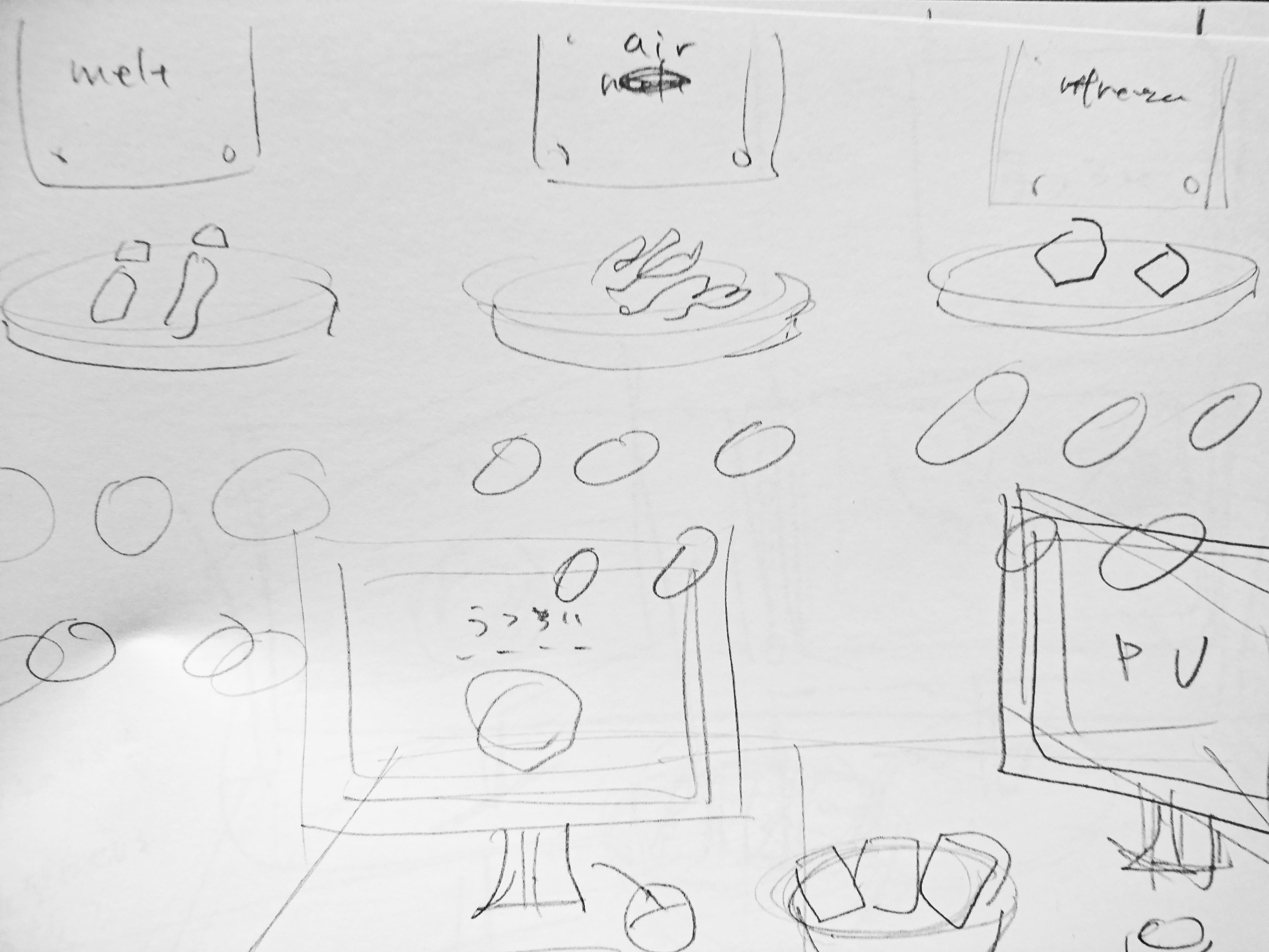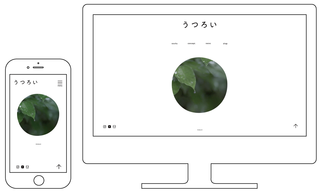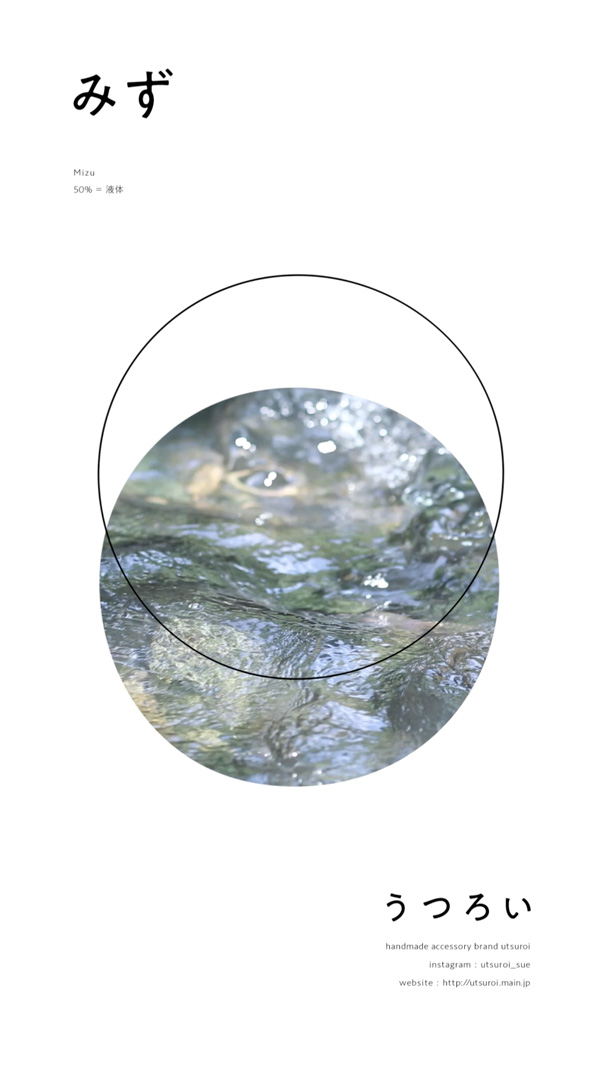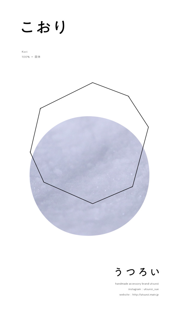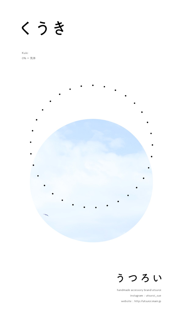 商品を紹介するカタログサイトを制作した。ブランドイメージを伝えるために、商品を一覧で見ることができる配置にした。また、どこでも気軽に見てもらうため、スマートフォンにも対応させた。うつろいの透明感や変化の様子を視覚的に感じてもらえるように、サイトのトップにプロモーションビデオを載せたり、うつろいのロゴ上でマウスを動かすと水面のように揺れる仕様になっている。気体・液体・固体が留まることなく循環する様子を、円形を使用することで表現した。