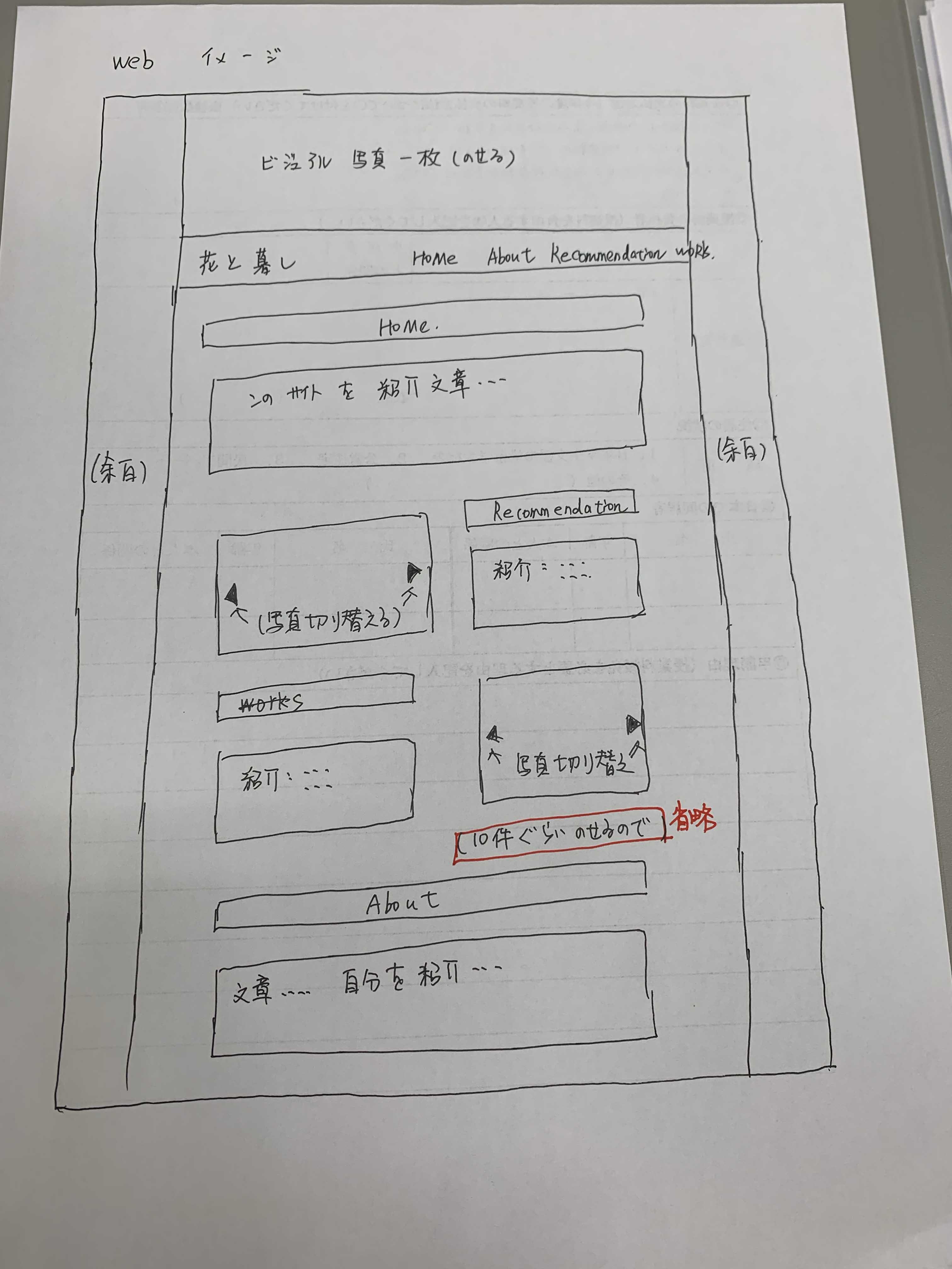 サイトのイメージ決まりHTMLの作成CSSの作成JSの作成作品の作成小物の撮影準備、ダイソーで写真の撮影写真を仕上げます写真をサイトに載せますGitHubにアップする