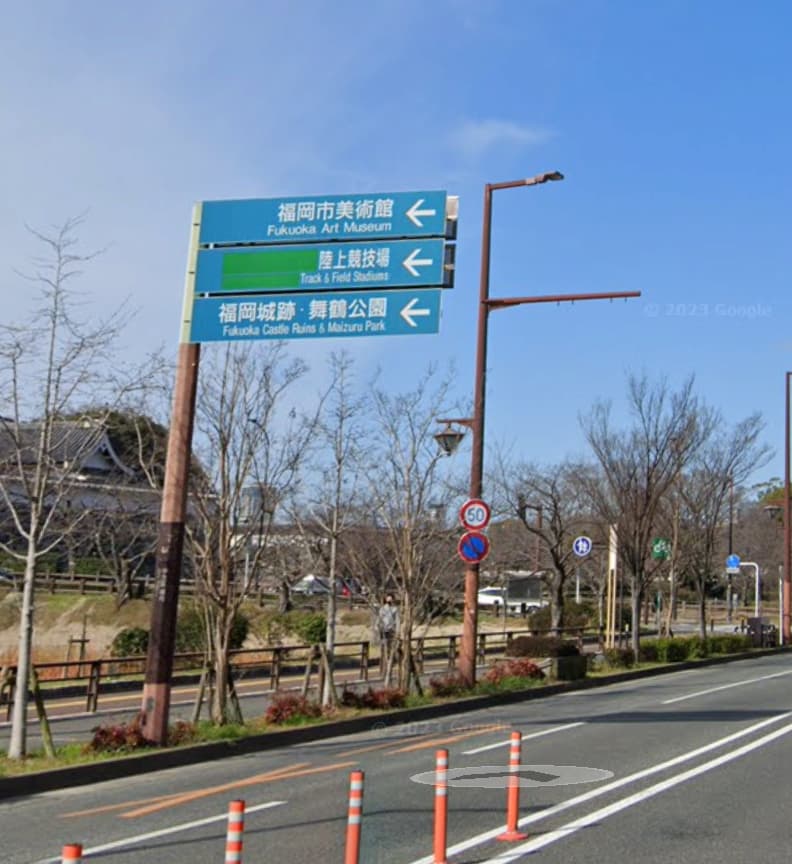 - 明治通りの道路標識(舞鶴公園線への誘導)が「福岡城趾・舞鶴公園」となっているため、並列の関係に見える(包含関係がわからない)