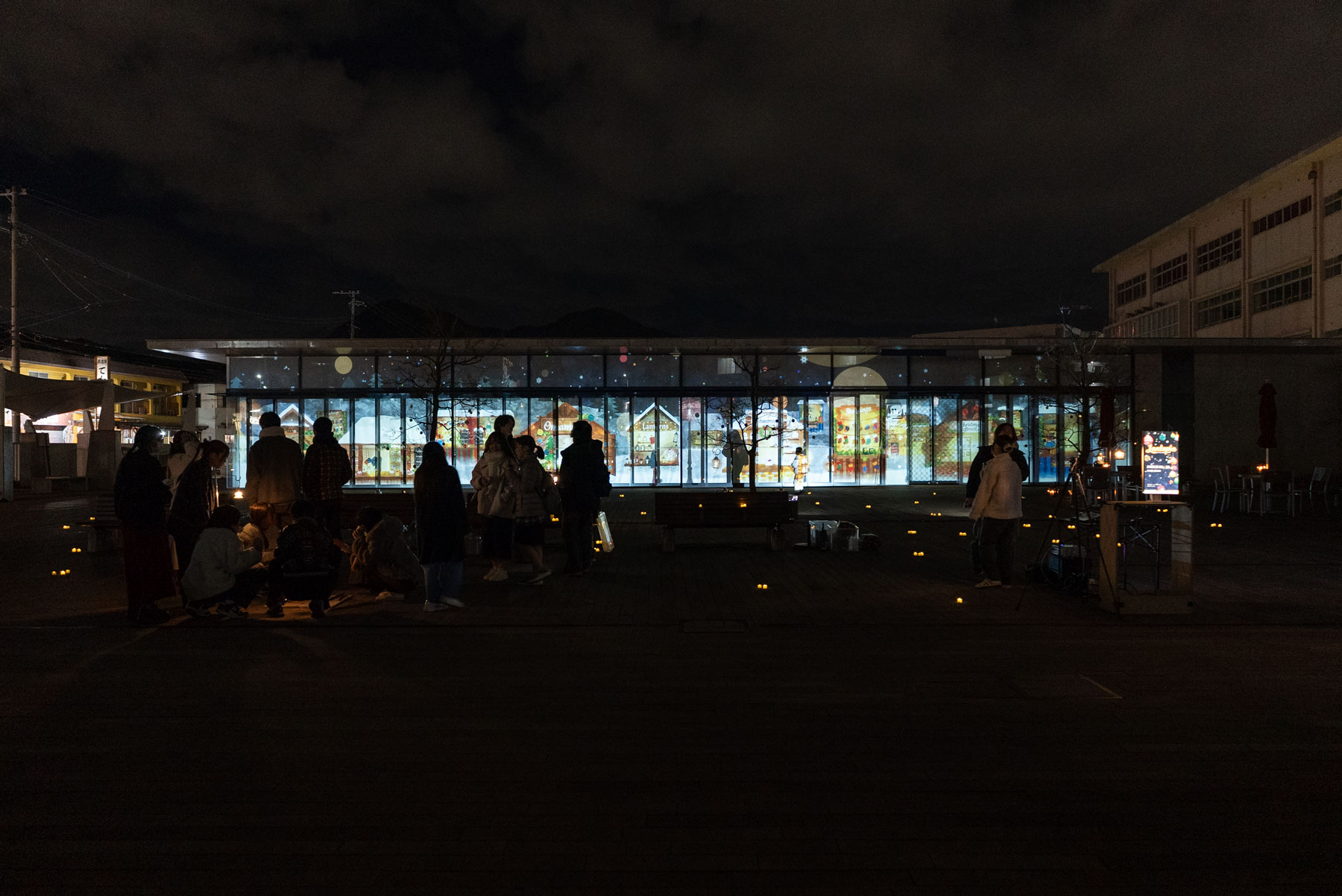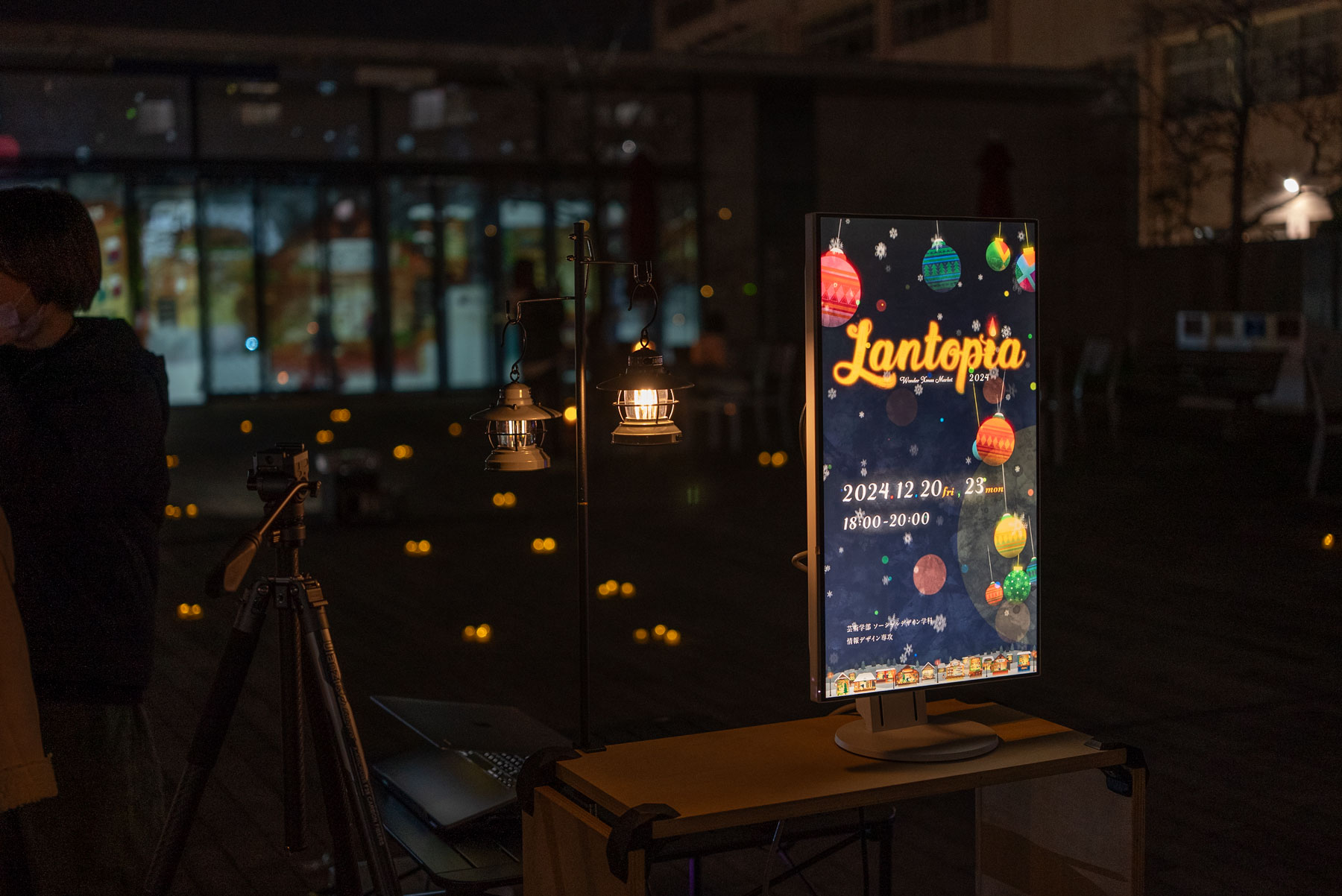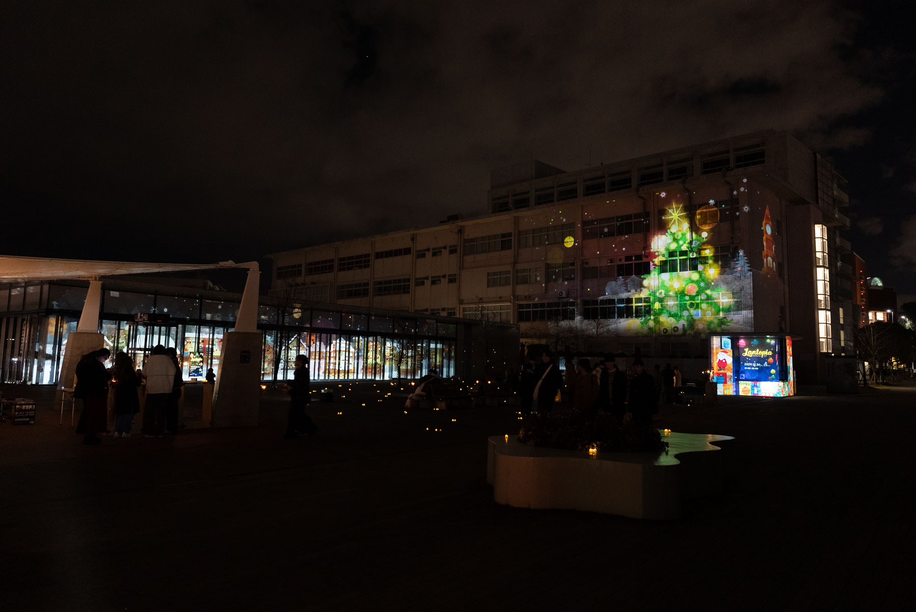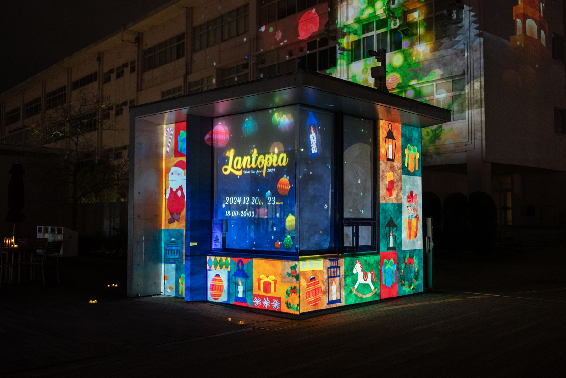 ソーシャルデザイン学科情報デザイン専攻の学生が制作した映像投影による空間演出です。今年は、クリスマスとマーケットとキャンドルをモチーフに幻想的なクリスマスの世界を表現しました。