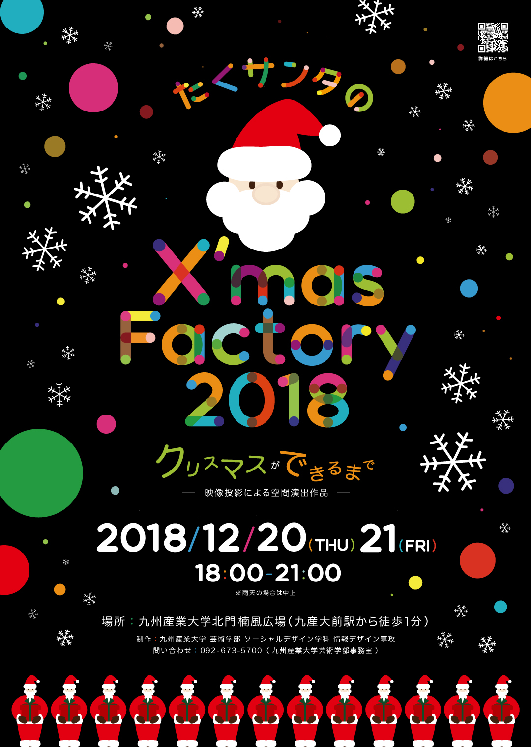 九州産業大学 芸術学部 ソーシャルデザイン学科 情報デザイン専攻の学生3名が映像投影による空間演出をします。たくさんのサンタによるクリスマス工場の世界をお楽しみください!