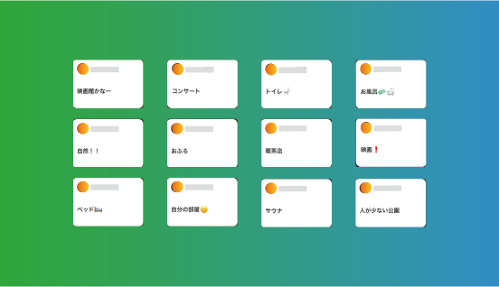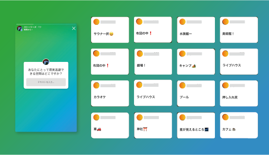 instagramのストーリーにて「あなたにとって現実逃避できる空間はどこですか?」というアンケートを行い20代の男女36人程度から回答を集めた結果、サウナ、映画館、テント、布団の中、カフェ、水族館、コンサートホールなどの回答を得ることができた。回答者があげた現実逃避空間の多くには「暗い」、「狭い」、「非日常的」空間であるという要素のいずれかが含まれているということがわかった。
