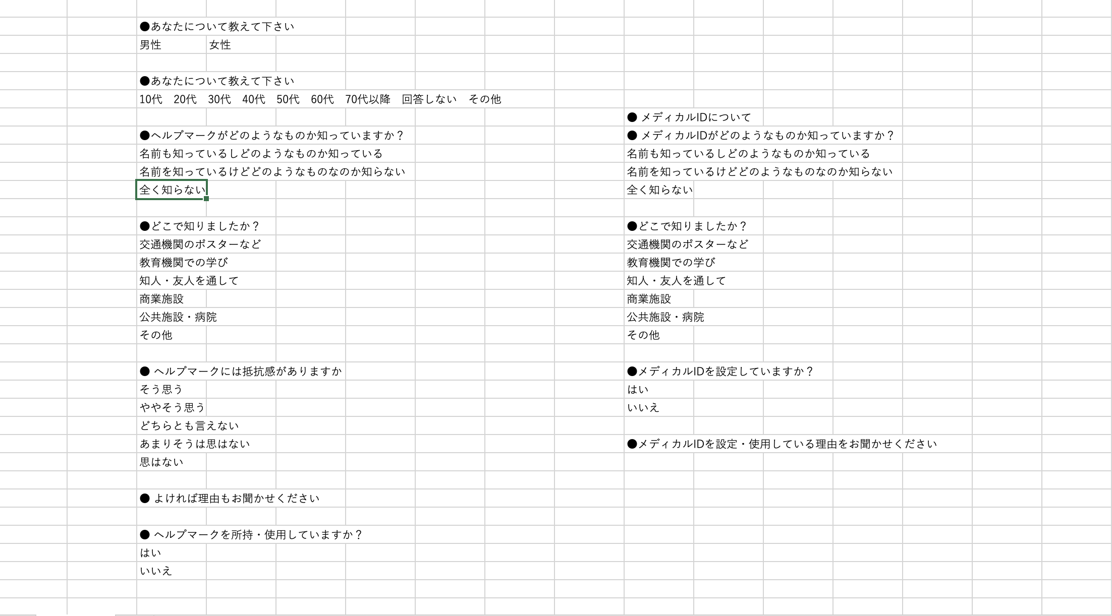 ヘルプマークの現状を調査した結果、100人中10人の割合でヘルプマークを使用していることがわった。しかし、最新の「ヘルプマーク利用状況」と「ヘルプマーク利用者の意見を取り入れたもの」が見当たらなかったため「双方の立場の意見を取り入れたアンケート」を実施する。 また、「アレルギー、病状、緊急連絡先など、緊急時に重要になる可能性のあるユーザの情報を提供」してくれる、メディカルIDに関する認知度や利用状況に関するデータが少なかったため、加えてアンケートを実施する。