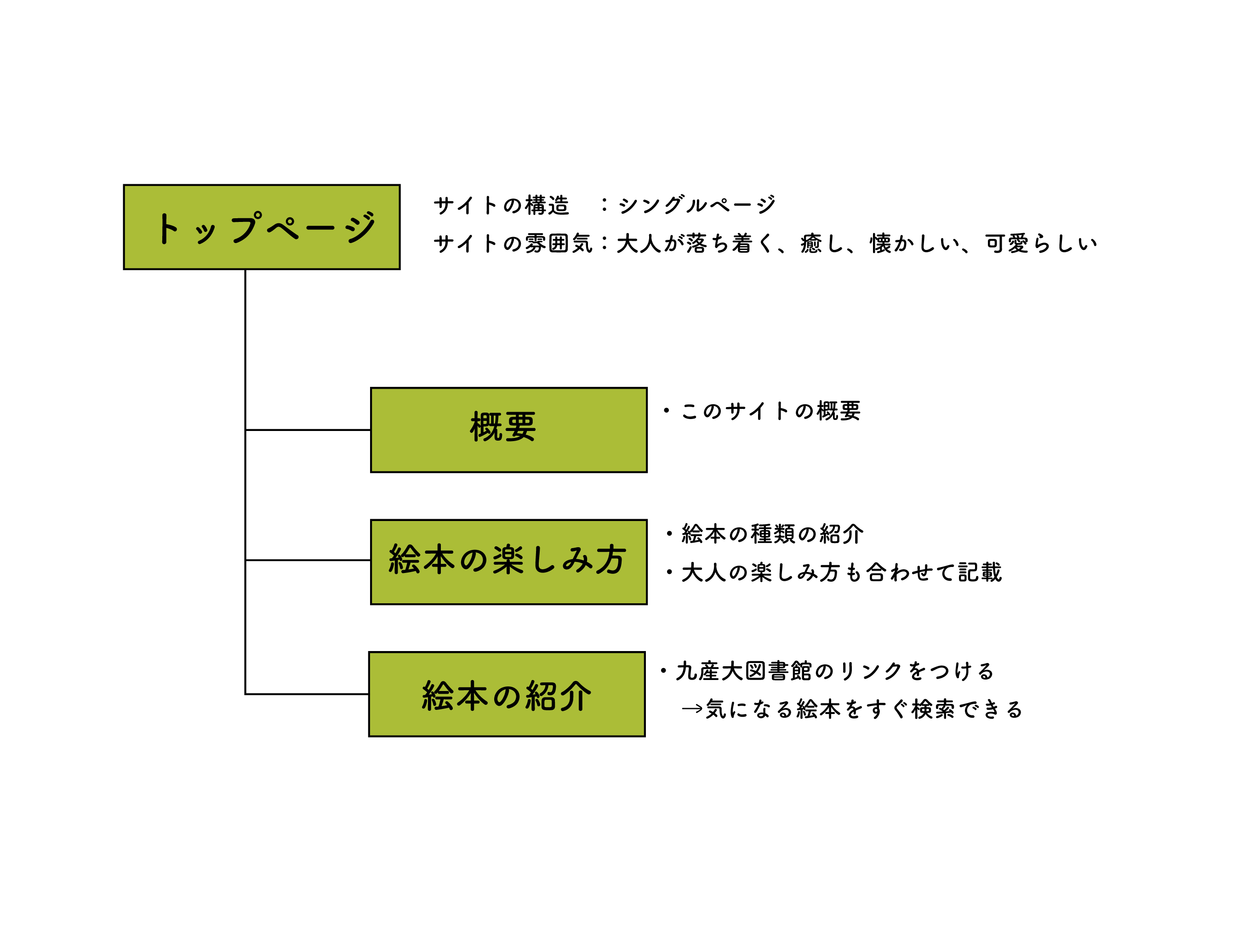 学生や社会人になって絵本から離れてしまった10代後半から20代に向けて、絵本の魅力を再確認してもらうため、九産大図書館に蔵書してある絵本を通して、絵本の概要や楽しみ方をまとめたWebサイトの制作を行う。