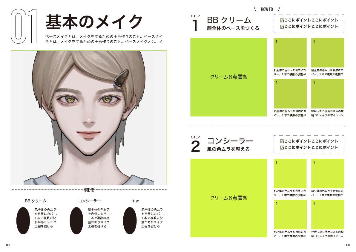 ワンポイントやQ&Aのページには、実際に男性にメイクした際の気づきや、普段メイクをしている男性から聞いたポイント、メイク初心者の方がつまづきやすいポイントとその解決方法などを書く予定である。