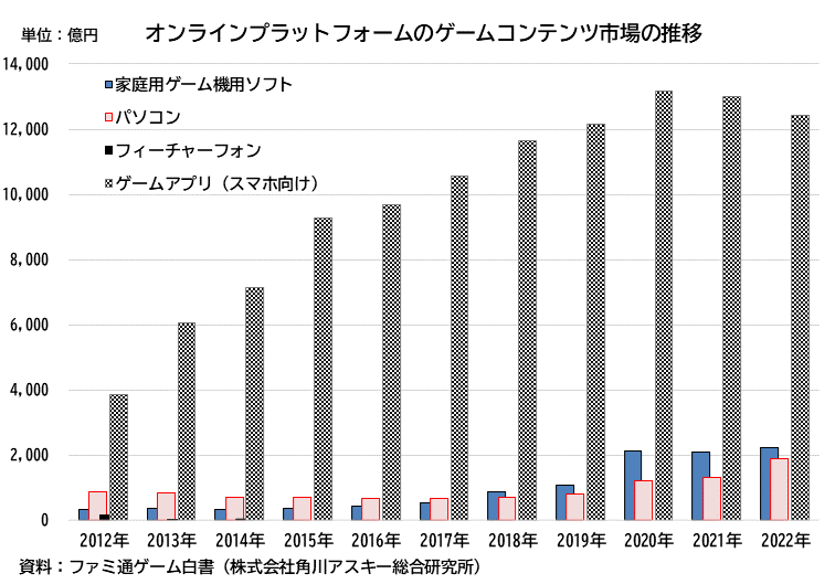 近年国内のゲーム市場は2020年には2兆円を突破し、高い市場規模を維持している。内訳はスマートフォンやパソコンを利用する「オンラインプラットフォーム(家庭用ゲーム機ソフト以外) 」が最も多く80パーセントを占めている。このことからオンラインプラットフォームがゲーム業界をけん引していることがわかる。