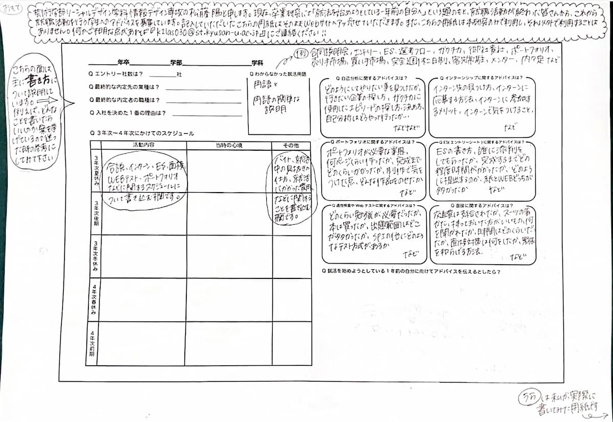 すでに就職活動を終えたソーシャルデザイン学科の学生が「就活を始めようとしている一年前の自分に向けてアドバイスを伝えるとしたら?」という問いに答え、その回答を通して次に就活を迎える学生たちの、就活に対する漠然とした不安感を軽減することを目的とした冊子の制作