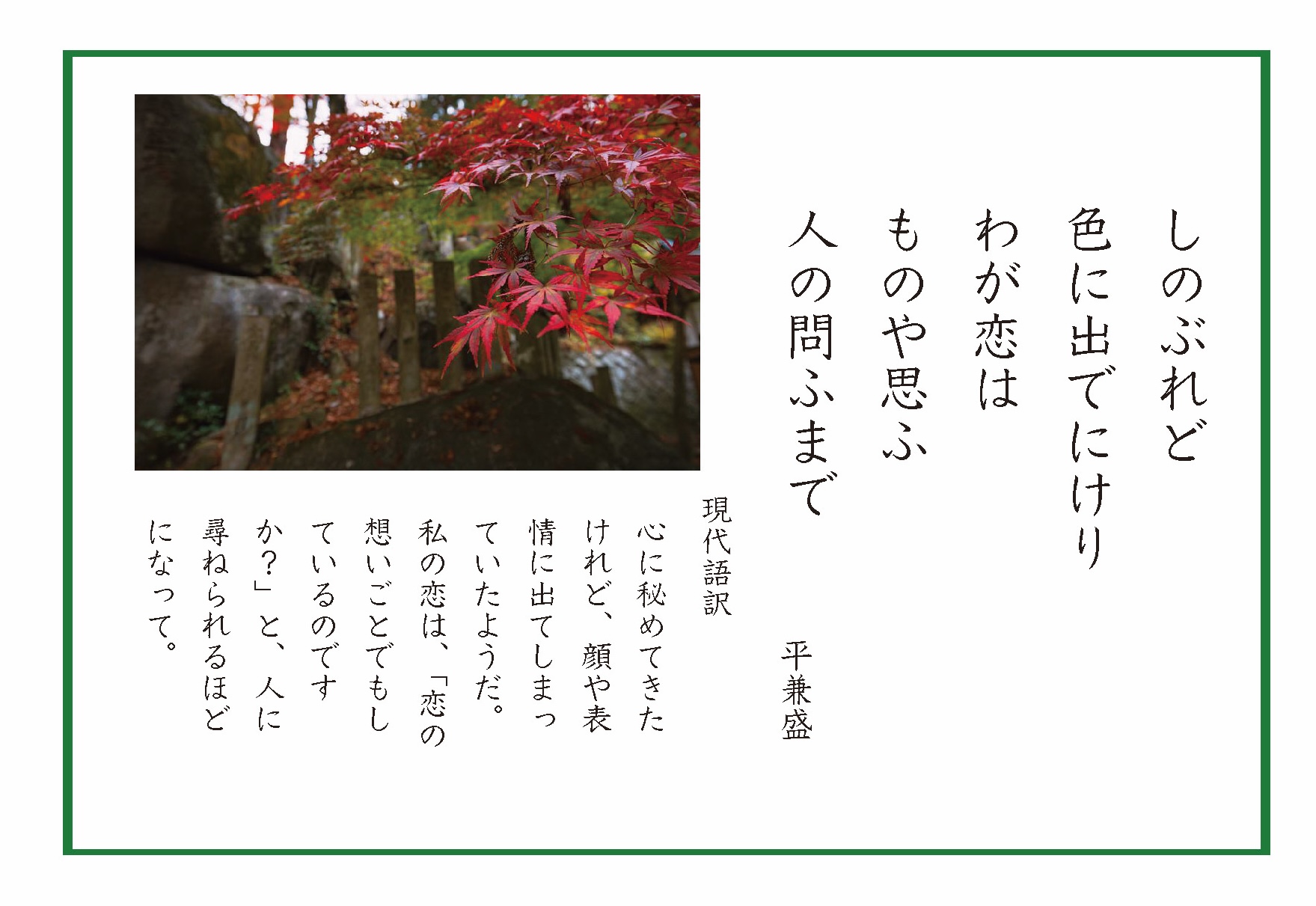 成果物を映像から冊子に変更するにあたり、現代語訳や入浴剤使用後も和歌をイメージしたイラストを載せることで使い捨てされないための工夫を考えた。しかし、現代語訳が固い文章で若者の興味や共感を得にくいと感じたため、古典の教科書や和歌の古典文法の本などを参考にしながら独自の現代語訳にしたい。