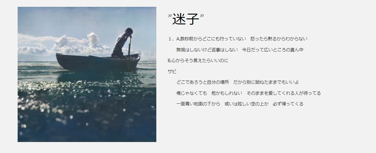 これは、写真から物語性やメッセージ性を読み取り、それを歌に乗せることを想定して歌詞として言語化する研究。思いを言葉に直すことの大切さや面白さを共有すべくwebサイトを制作する。なお、イメージ素材としては、私的なものを避け、パブリックドメインの画像を利用する。また、写真一枚一枚から感じたことからBGMを作成し、10枚の写真を選出し、一つの一貫性のあるアルバムとしても、楽しめるよう制作し、記載する。テーマは、‘‘再生‘‘とする。
