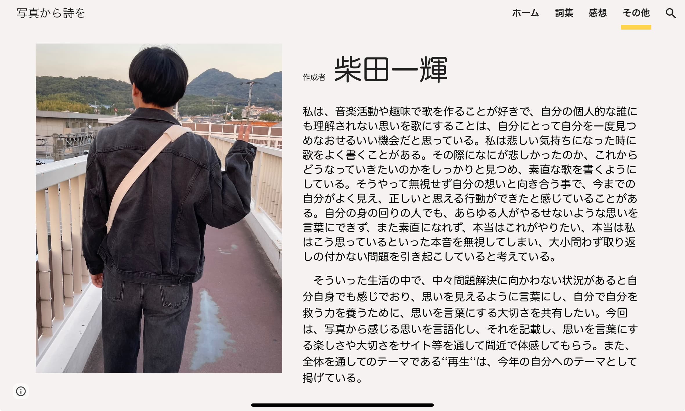 社会には、思ったことを言語化できず、なかなか問題解決 に向かうことができない人がたくさんいる。友人や知り合いの話や SNS での情報を見聞きすると、問題などにぶつかった際に、素直な気持ちを隠したり、怖くて認められないような方がいるようだ。私も日常生活の中で、そういった問題を抱えることがある。その際に、曲を書き、思いを言葉や音にしている。そうして出来上がった歌詞を見ると、うまく今の自分がよく見え、素直な気持ちと向き合うことができ、問題解決を迎えることができた。 今回は、選出した写真から感じたことを歌詞にして、作品を記載し、思いを言葉にする様子を見ていただき、その大切さに気づいてもらうサイトを制作する。