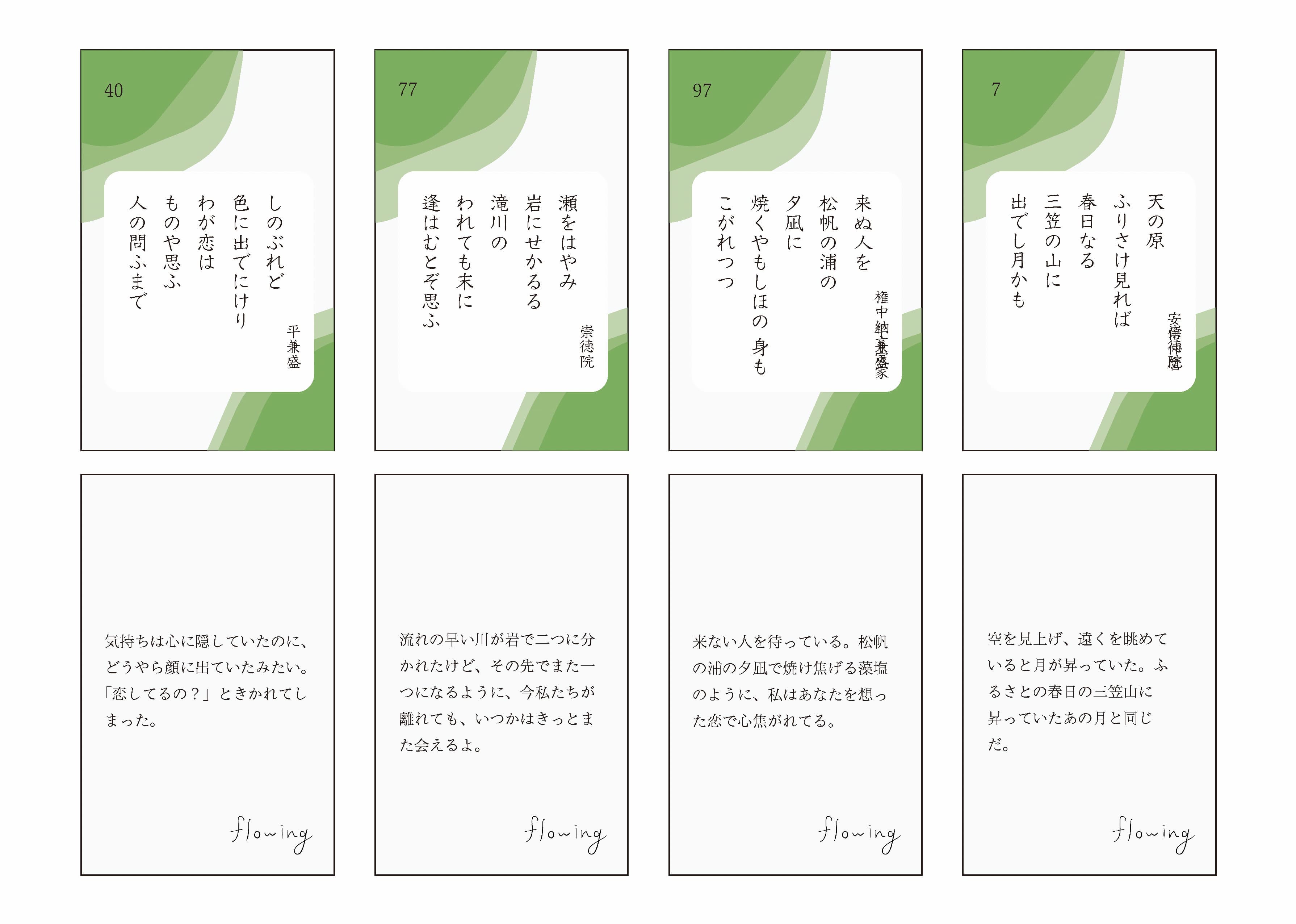 百人一首をモチーフにした入浴剤と現代語訳が書かれたカードを作成し、新たな入浴方法を提案する