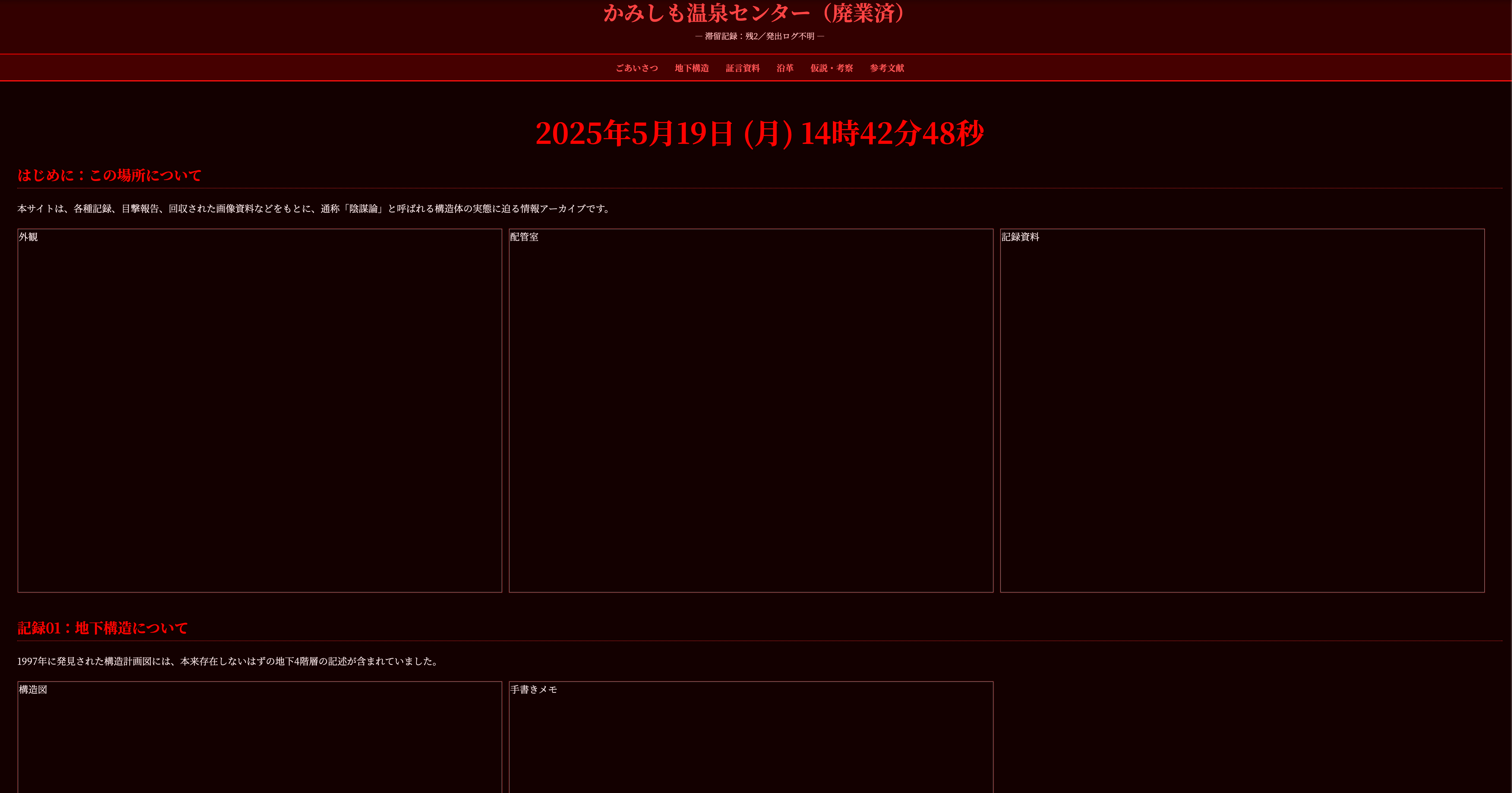 - Keywords:陰謀論,webデザイン,かみしも温泉センター(廃業済み)という架空のサイト,電波系サイト