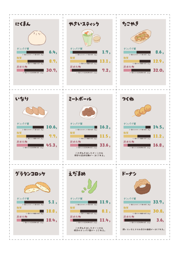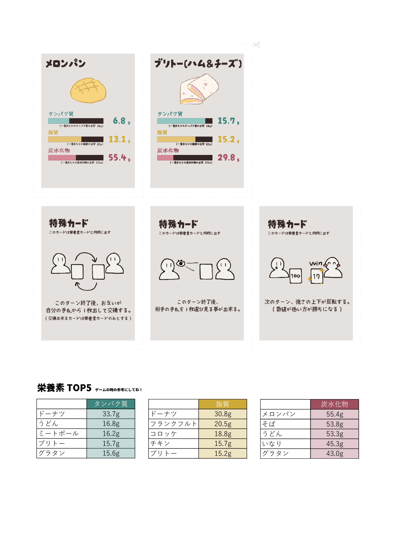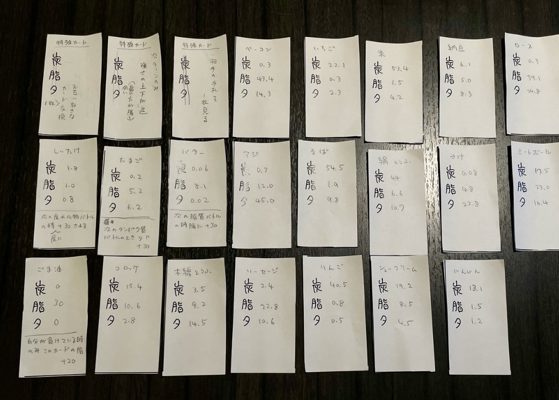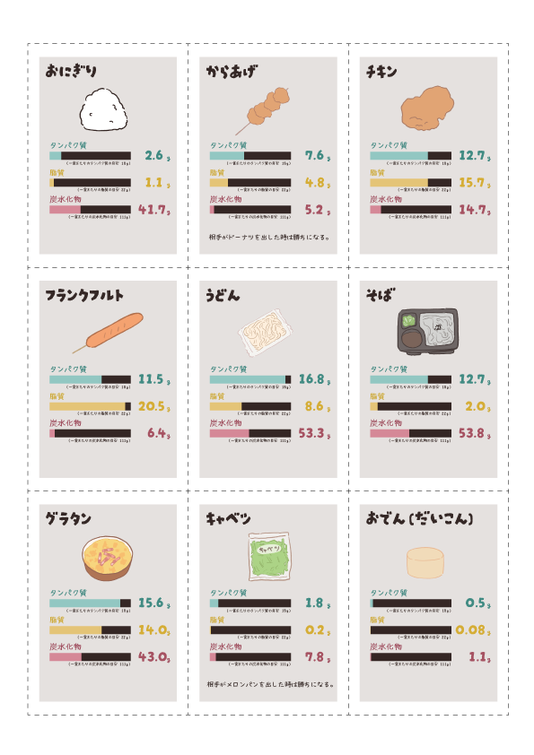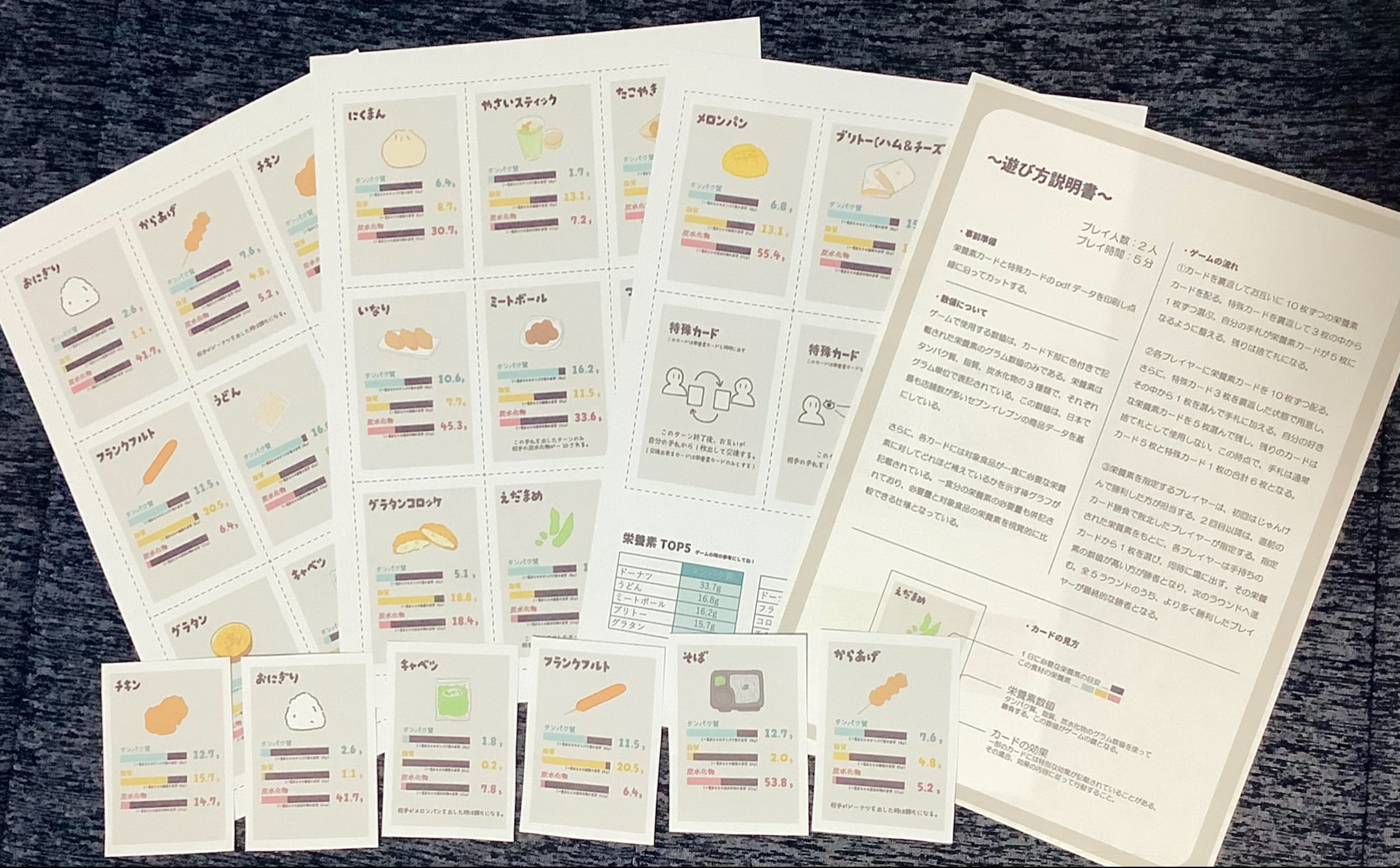素材を印刷して切るだけで栄養素や食材の知識を気軽に遊びながら学べるカードゲーム。