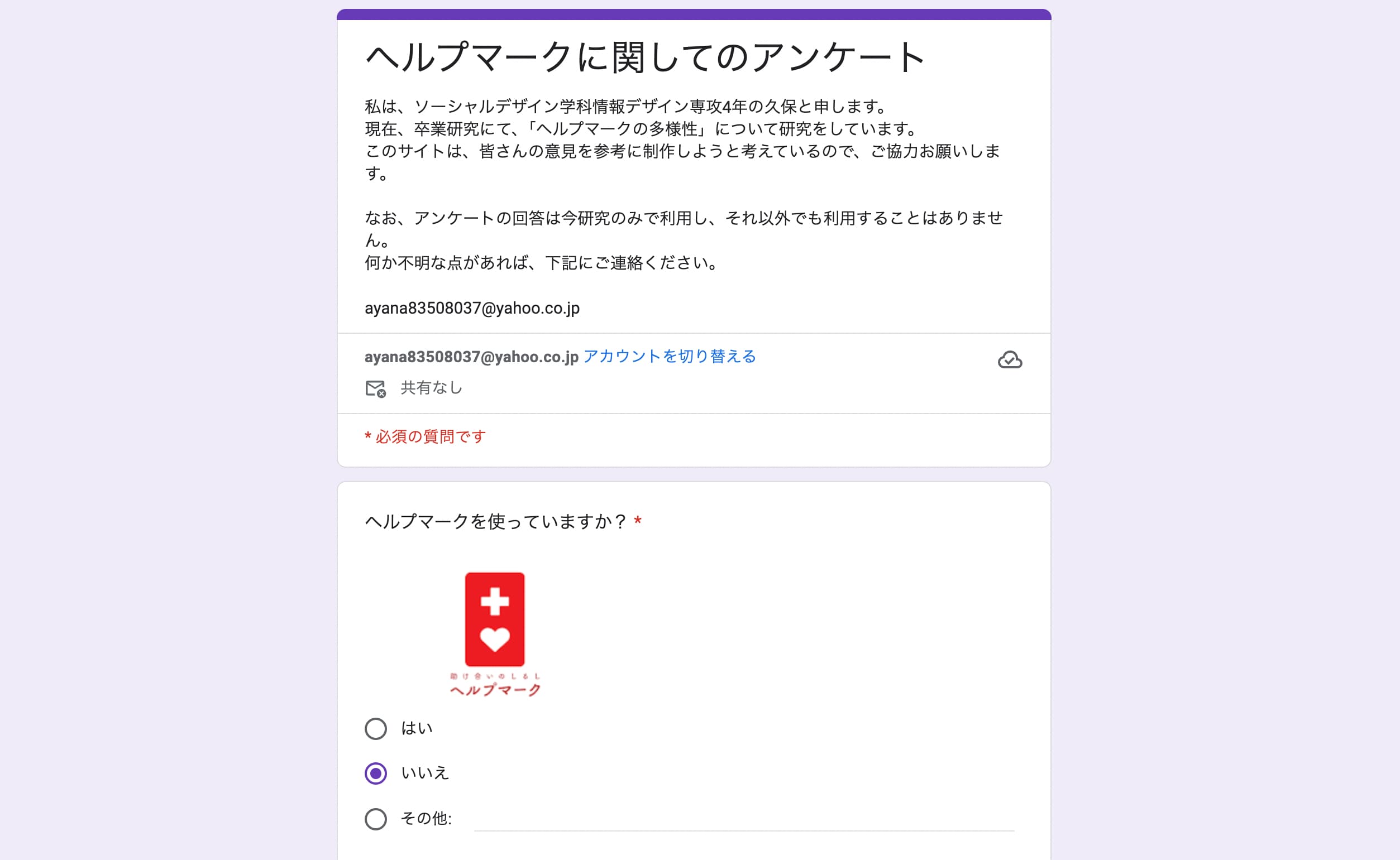 ヘルプマークの現状を調査した結果、100人中10人の割合でヘルプマークを使用していることがわった。しかし、最新の「ヘルプマーク利用状況」と「ヘルプマーク利用者の意見を取り入れたもの」が見当たらなかったため「双方の立場の意見を取り入れたアンケート」を実施する。 また、「アレルギー、病状、緊急連絡先など、緊急時に重要になる可能性のあるユーザの情報を提供」してくれる、メディカルIDに関する認知度や利用状況に関するデータが少なかったため、加えてアンケートを実施する。