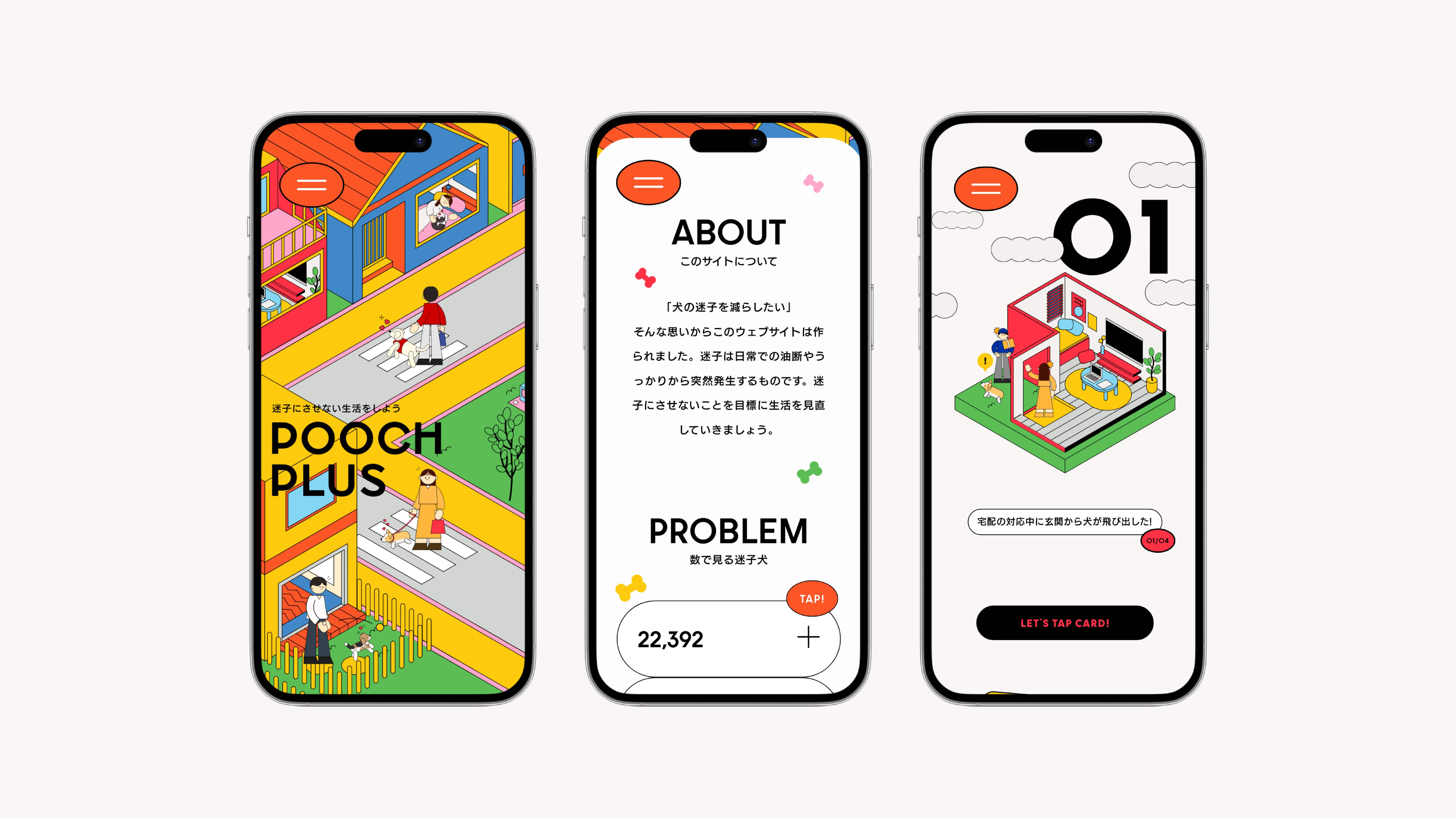 迷子対策をネガティブなイメージで捉えるのではなく、愛犬との生活をより良くするためのポジティブなイメージとして捉えてもらいたいため、ポップな印象のデザインにする。また、犬を飼い始めた人や飼おうと思っている人にもわかりやすいよう、用途に分けてイラストを使用する。