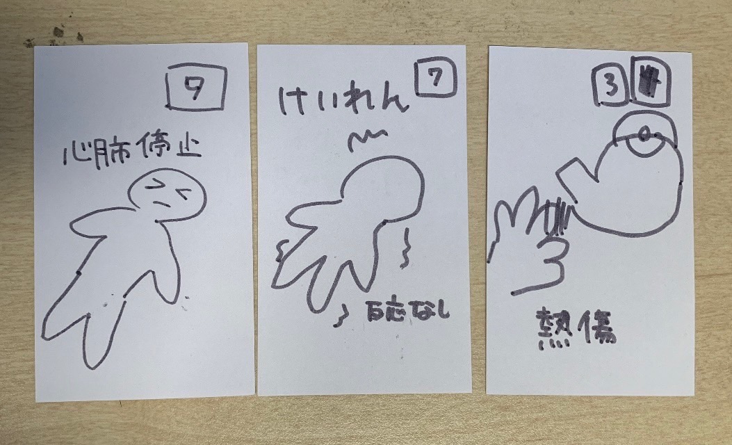 カードには「心肺停止」「けいれん」「熱傷」などの症状名とイラスト、さらに必要なアクションカードの枚数が書かれています。