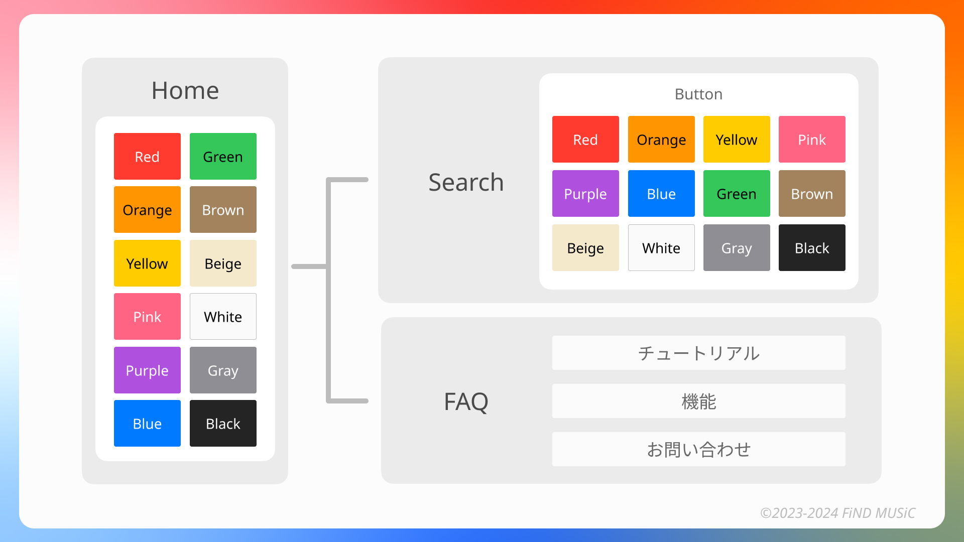 画面下のメニューからサーチ画面に移動すると12色のボタンが表示される。色ボタンをどれか1つタップするとボタンの色に関連した色のジャケット写真が色ボタンの下に表示される。表示中のジャケット写真を横スクロールすると他のジャケット写真を見ることができる。また、ジャケット写真を押すと30秒程度の試聴音源が流れる仕組みである。