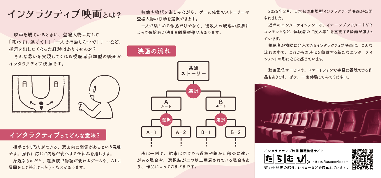 - 特定のインタラクティブ作品のレビューなどはあったものの、インタラクティブ映画というジャンル自体を掘り下げるものは見つかりませんでした。また、映画館のサイトでもインタラクティブ映画自体の説明がほとんどなく、気軽に体験しづらいのではないかと感じました。
