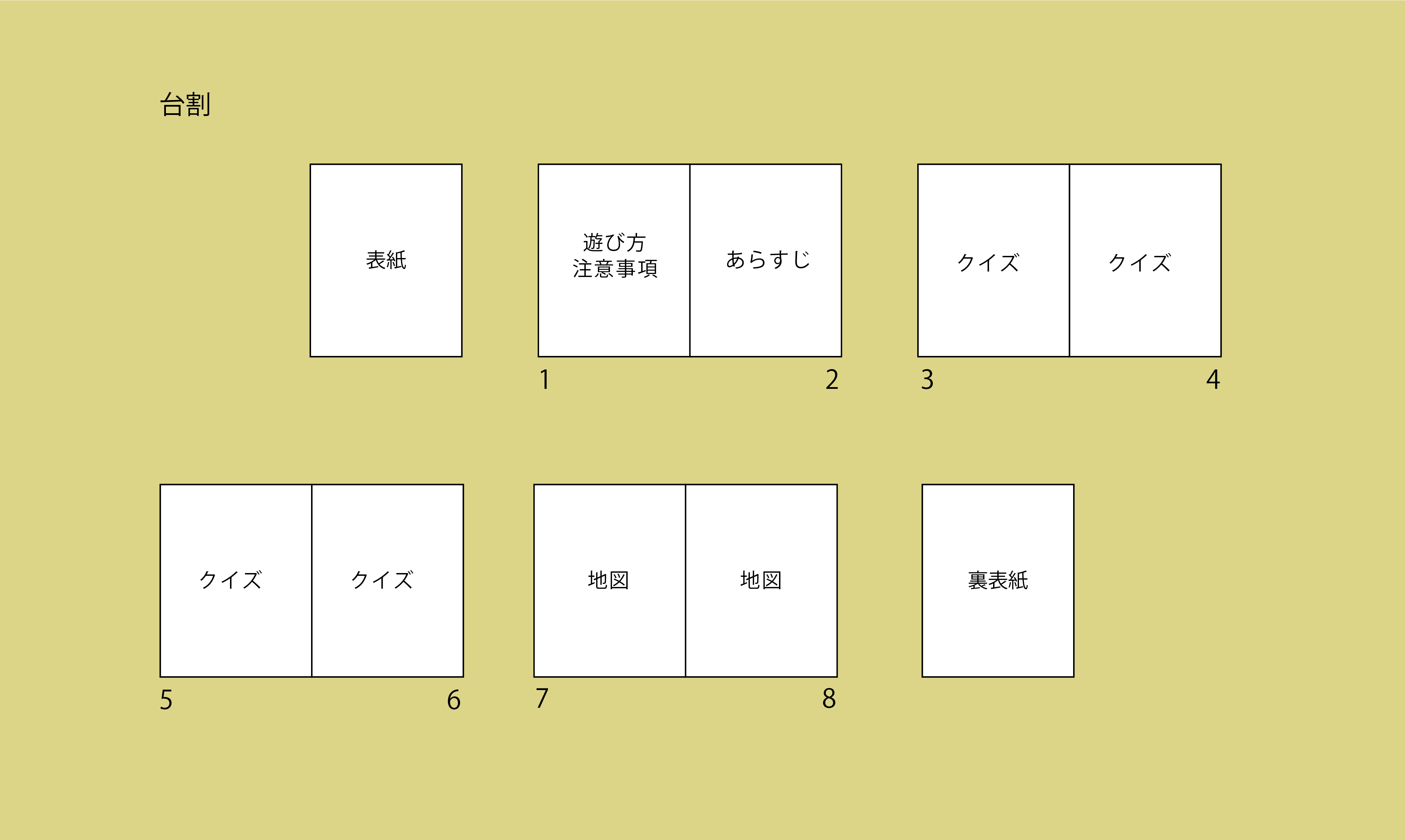 →冊子内の複数のページやカードを特定の順序で並べると、地図やキーワードが浮かび上がる
