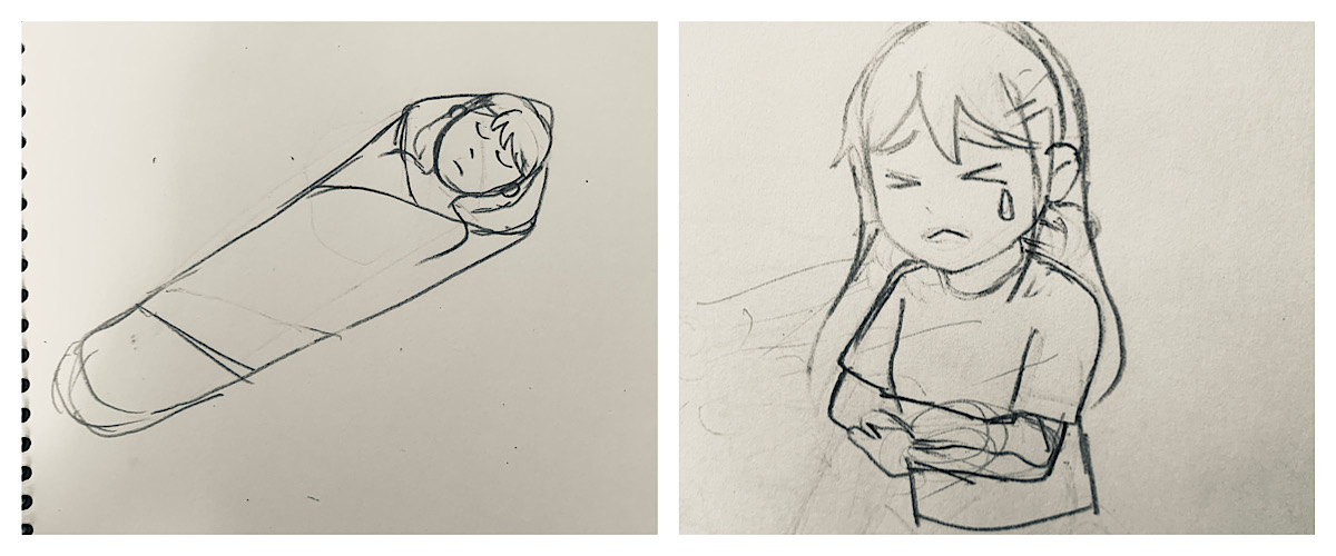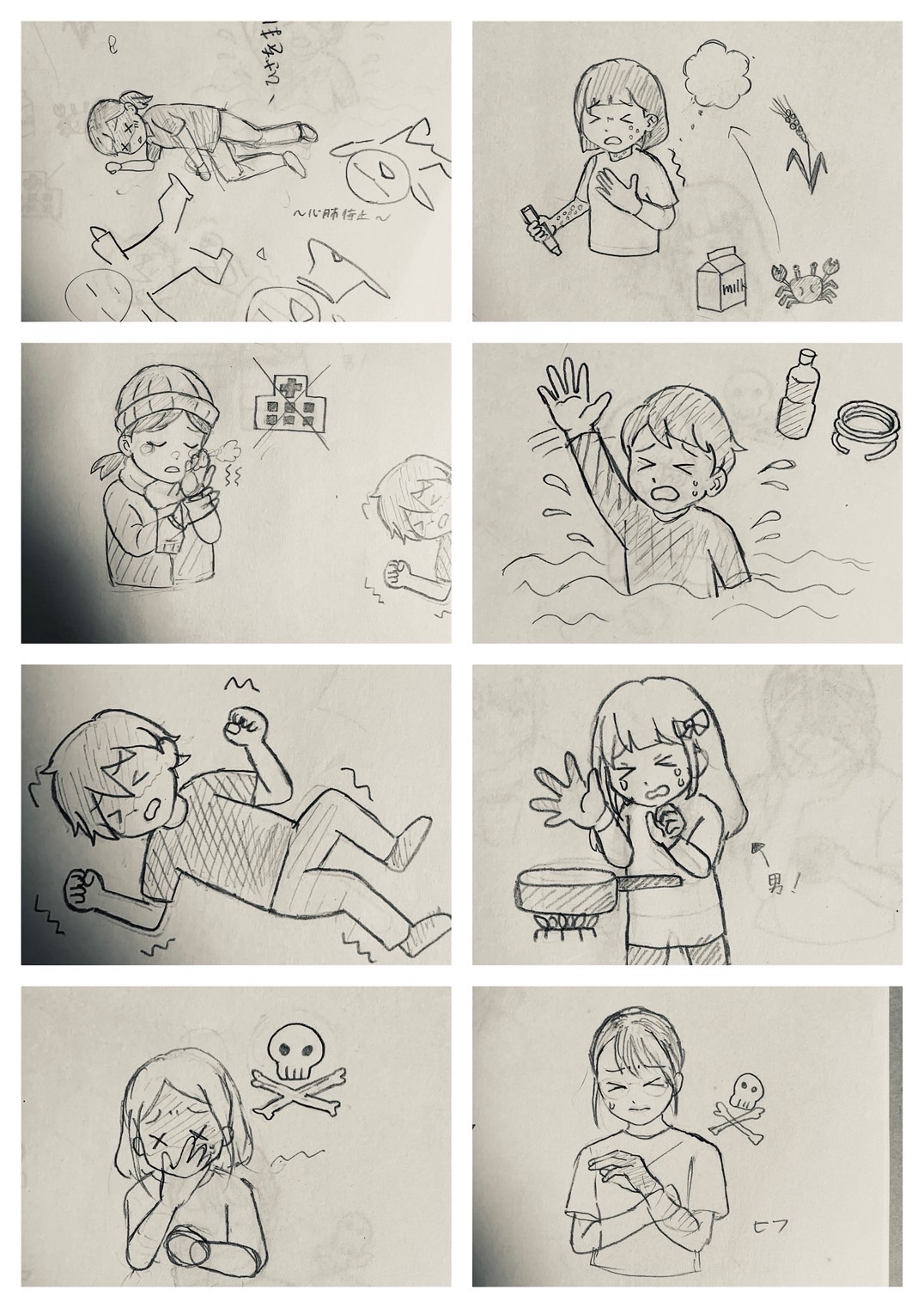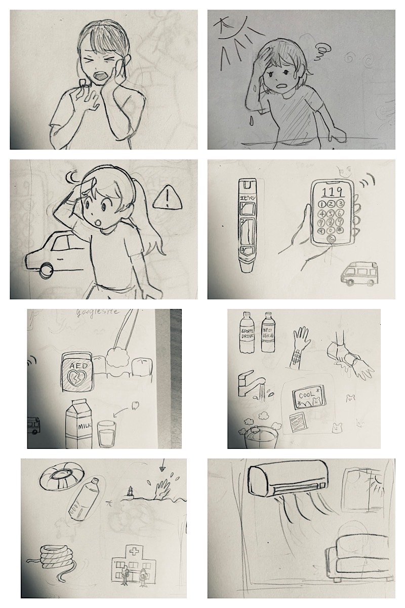 総務省消防庁が提供している eラーニングや日本赤十字社の心配蘇生のリーフレット、自撮り、先行作品を参考にラフをアナログで作成