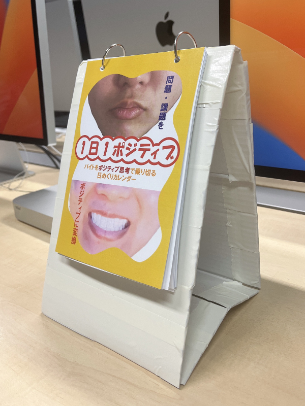 近年、退職代行などを使って仕事を辞める人が増加したり、若者の転職率が高いなど、仕事に関するネガティブな印象が強くなっている。私自身もアルバイトで問題や課題に直面した時にネガティブ思考になりやすくなっている。そこで「仕事中に発生するであろう問題や課題をポジティブ思考で乗り越える」というテーマを考えた。毎日仕事をする人が多いため、毎日利用できるポジティブ思考の日めくりカレンダーを製作する。また、カレンダーの利用者が1日1回はポジティブ思考で仕事を行えるようになることを目的とする。