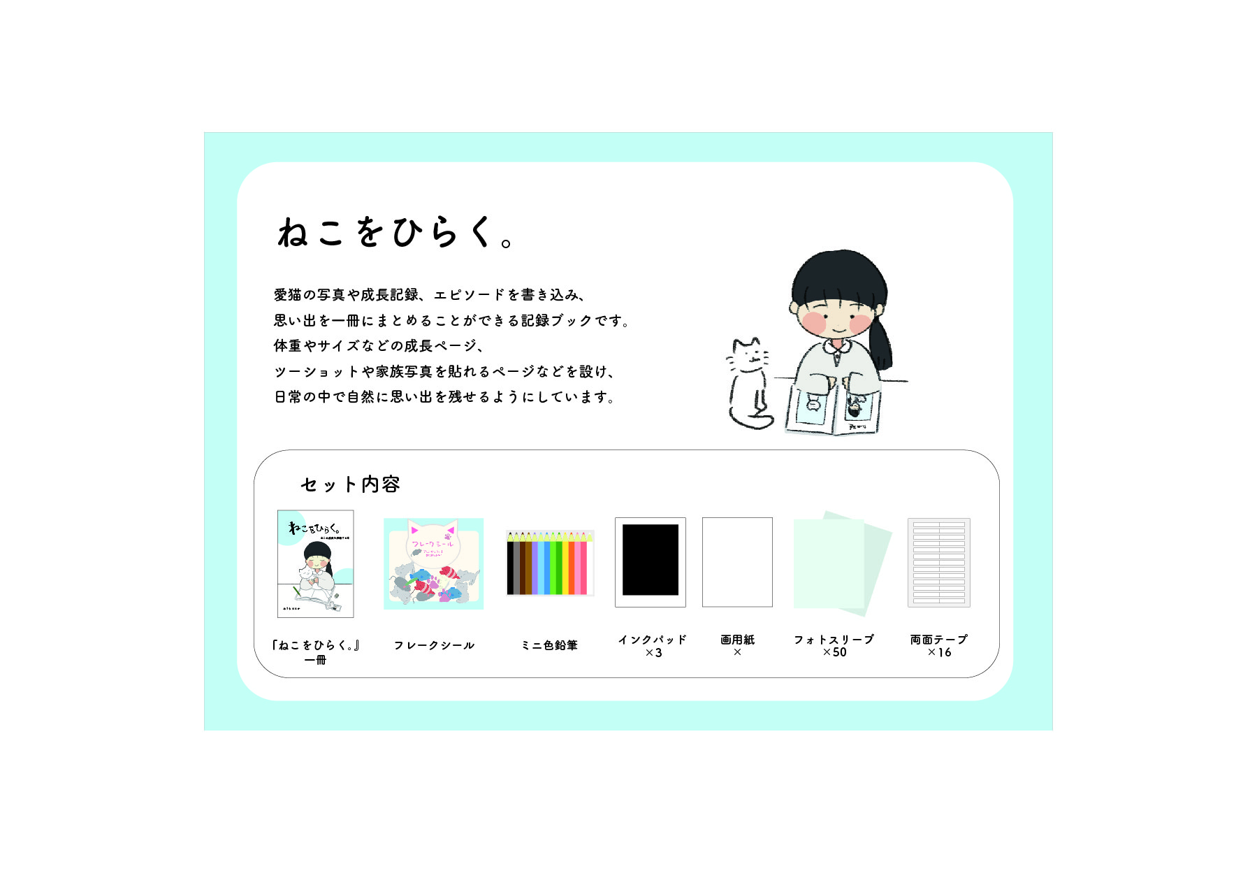 - 猫の姿や色、爪などを思い出せる猫用アルバム