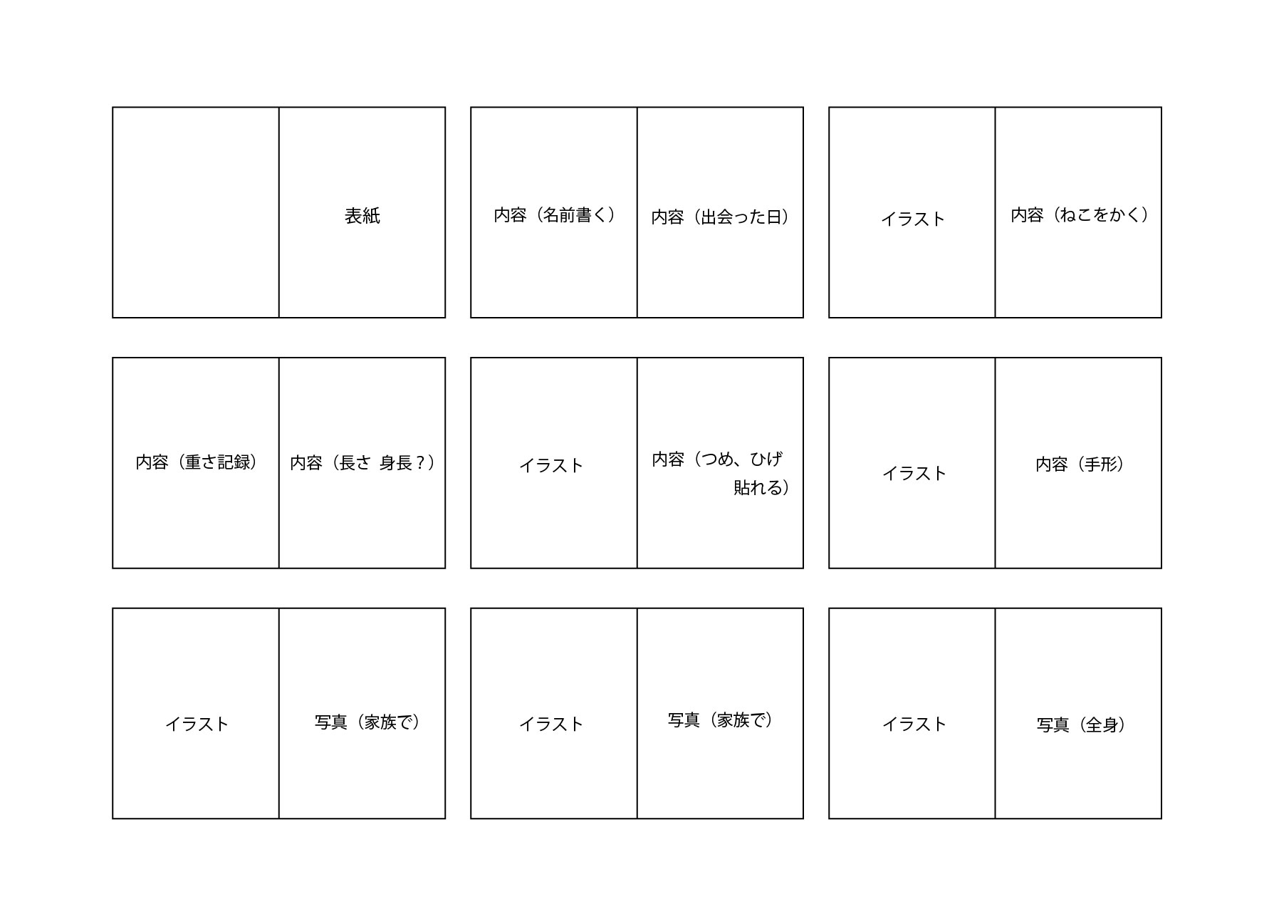 ページ数→すぐに撮れ貼れるものを多く作り、その他はフリースペースとする。一年ごとの記録を貼ってもいいし、絵を描いたり、その他の写真を貼っても可。