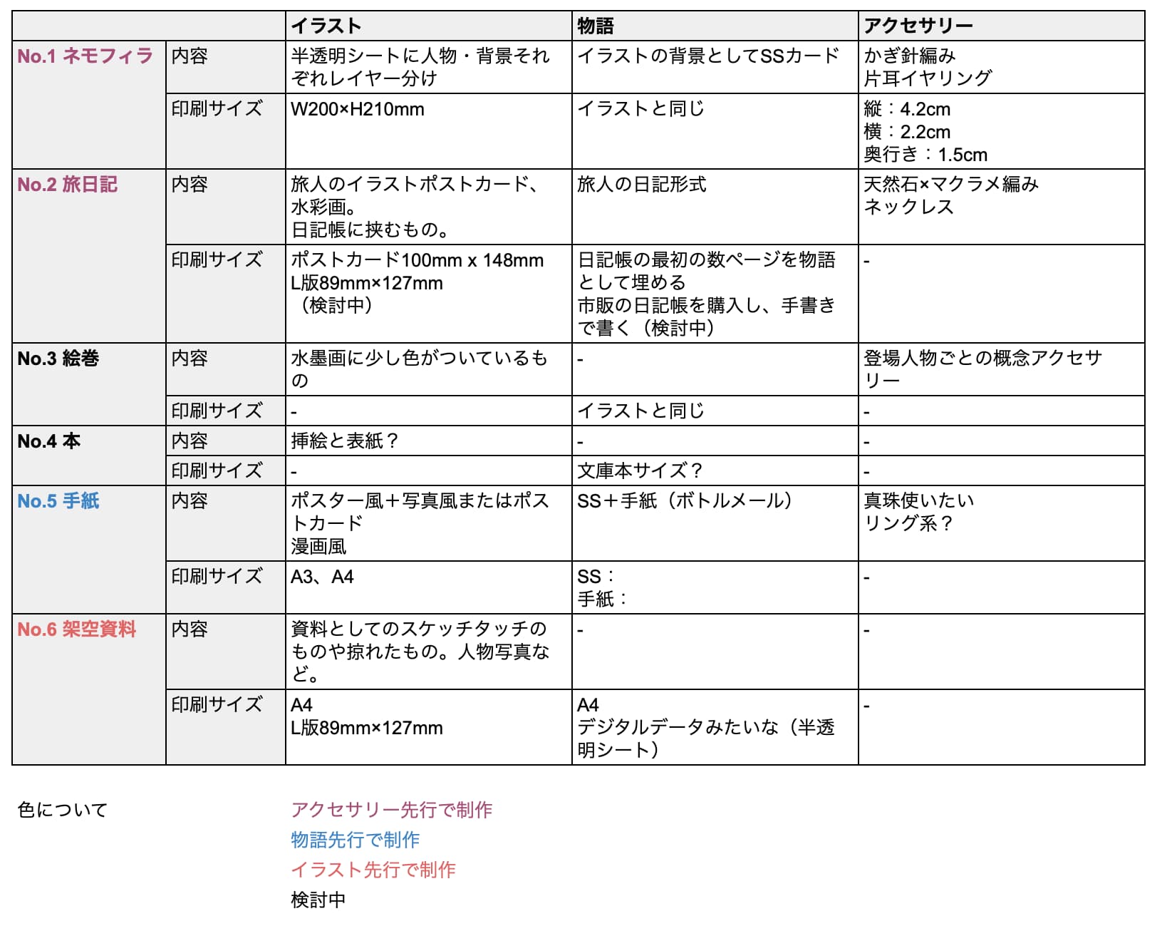 - イラストや物語先行のアクセサリー制作について、デザイン画を描いて確認することで他二つの媒体と世界観を合わせていきたい。(大井)