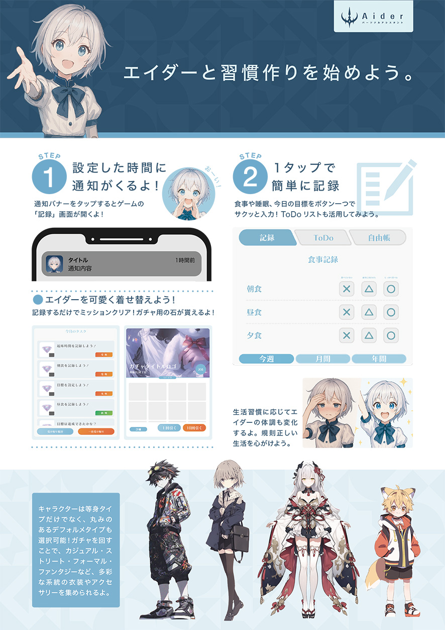 本作は、着せ替えゲームのコレクション欲・カスタマイズ欲を軸に、タスク管理とAI生活支援を融合させた新感覚ゲームである。プレイヤーは食事、仕事、睡眠など現実のタスクをゲーム内ミッションとして遂行し、達成報酬として通貨を獲得、ガチャを回してファッションアイテムを入手・装飾する。AI搭載キャラクター「エイダー」は現実時間と連動し、スケジュール管理や議事録作成、献立提案、タイマー、予定のお知らせなどを担う生活アシスタントとして機能する。生活リズムが乱れるとエイダーの状態にも悪影響が生じ、プレイヤーが自己管理を見直す動機となる。娯楽性と実用性を両立し、「自分を整えることがキャラを幸せにする」という感情的報酬設計により、楽しみながら自己管理力を育むことができる。