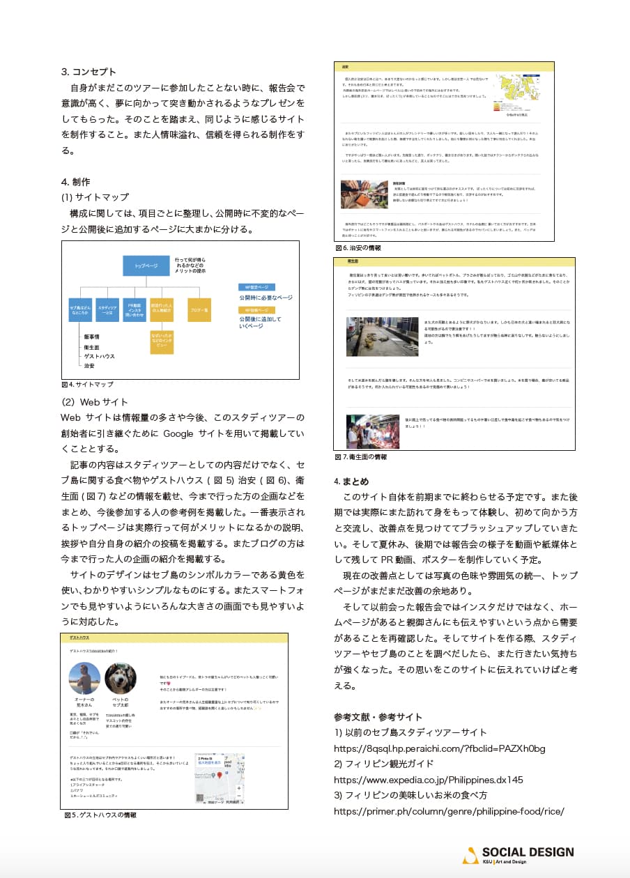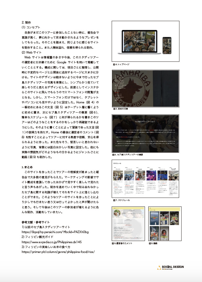 (後期)このサイトを作ったことでツアーの理解度が高まったと報告会で大多数の意見がもらえた。マーケティングの要領でサイト構成を意識して作ったおかげで見やすく楽しんで見れたと言う声もあがった。制作を進めていく中で知る由もなかったセブ島に関する知識が増えてそれをサイト上に落とし込むことができた。このようなツアーのサイトを作ったことにより少しでも行きたい思う又は行ってよかったと声が聞けたらと思う。そして今後はこのツアーの参加者が増えるように色んな制作、活動をしていきたい。