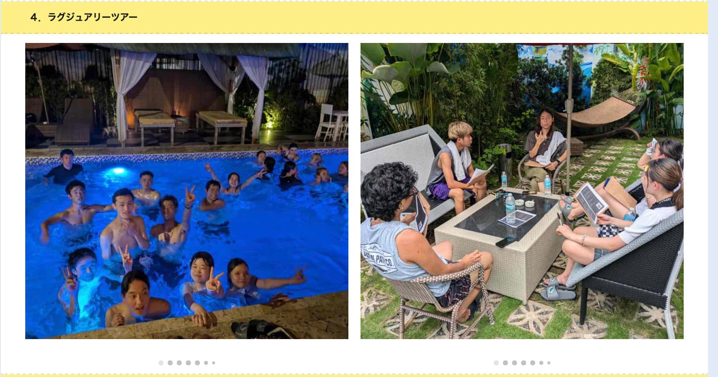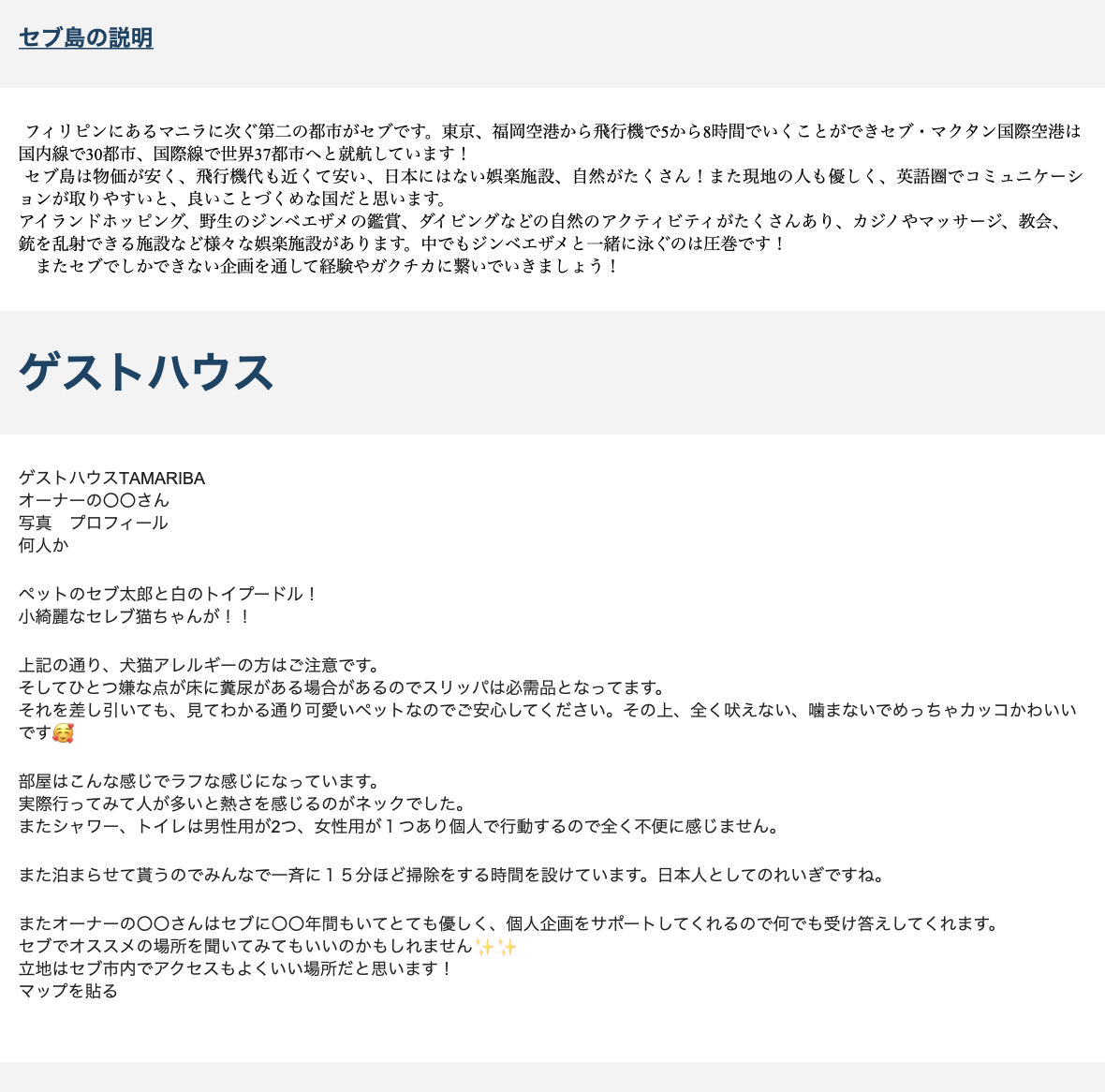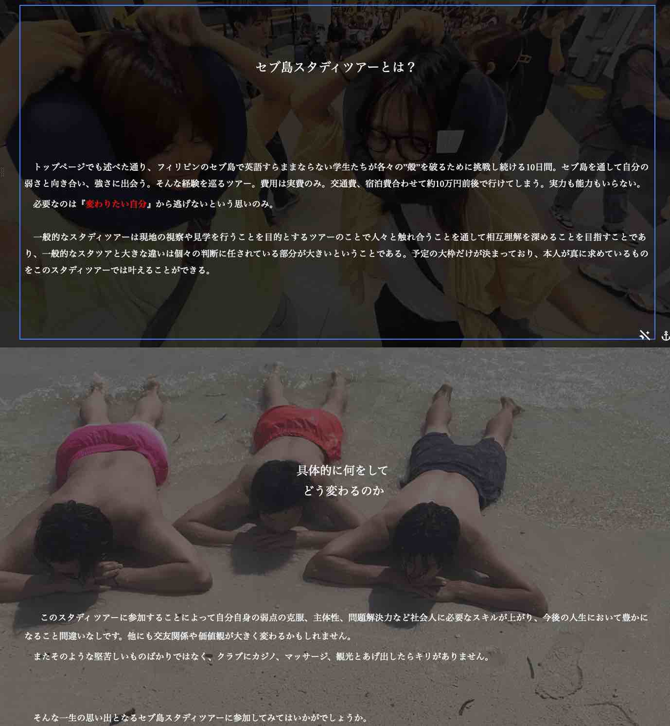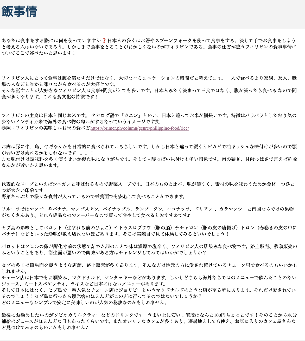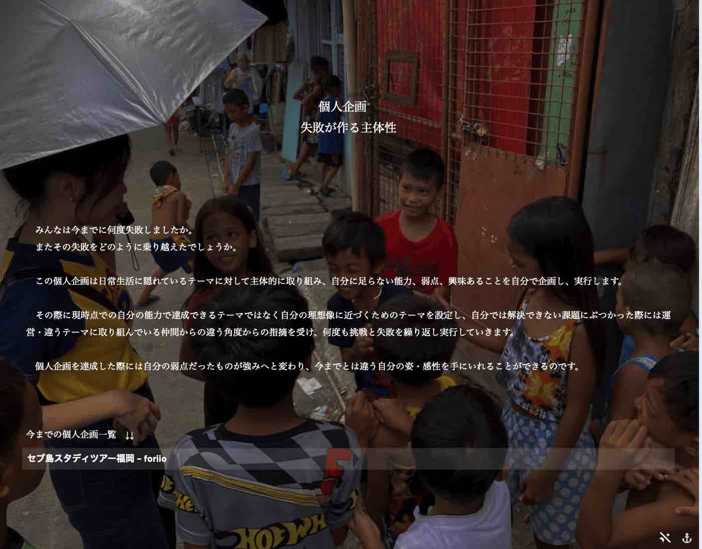 そして以前会った報告会ではインスタだけではなく、ホームページがあると親御さんにも伝えやすいという点から需要があることを再確認した。そしてサイトを作る際、スタディツアーやセブ島のことを調べだしたらまたいきたい気持ちが強くなった。その思いをこのサイトに伝えれていけばと考えています。