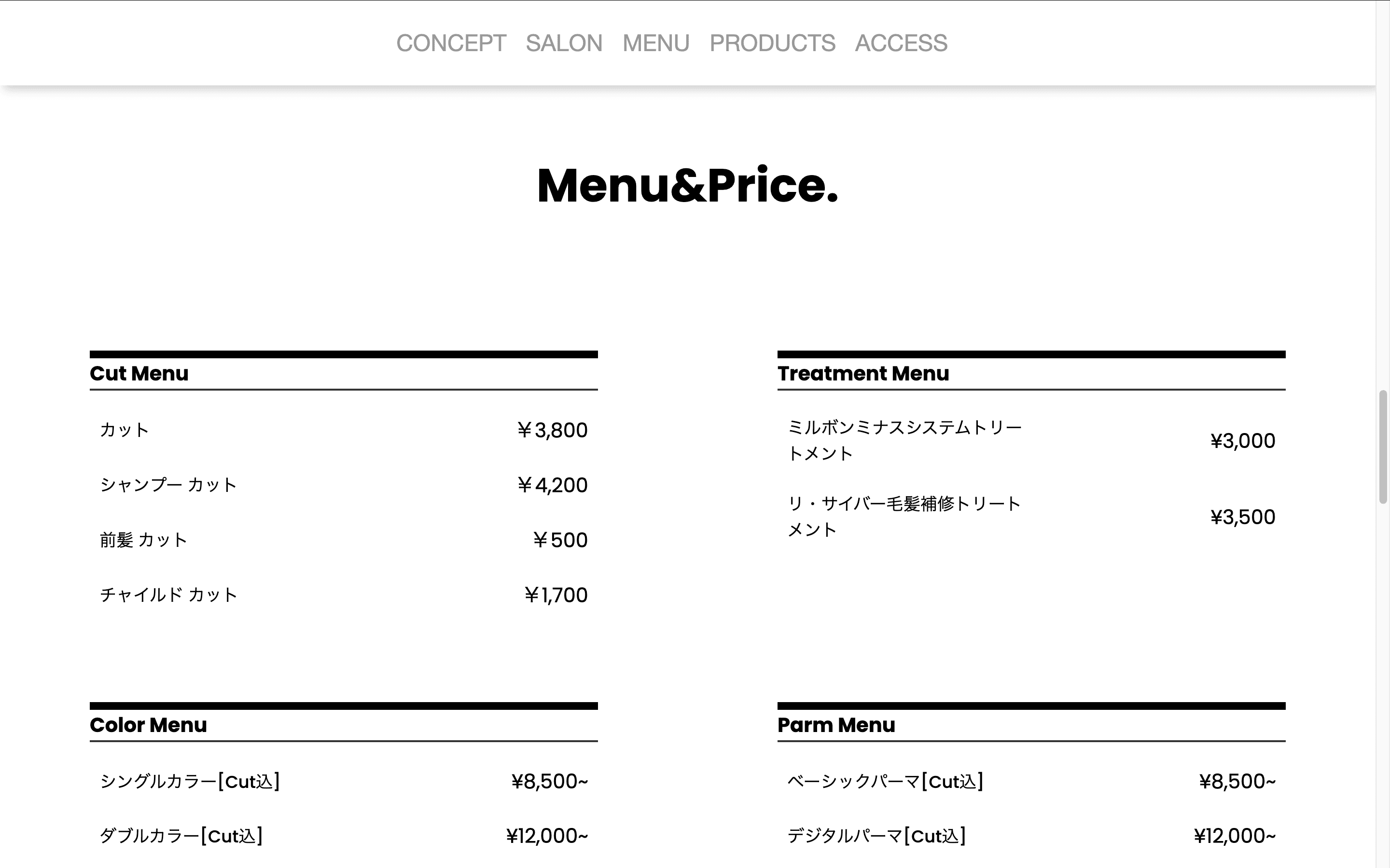 - 現在のWebサイトに明記されていない情報を掲示し、レスポンシブ対応など整理されている内容のWebサイトの制作し美容室の第一印象をより良くするWebサイトを目指す。