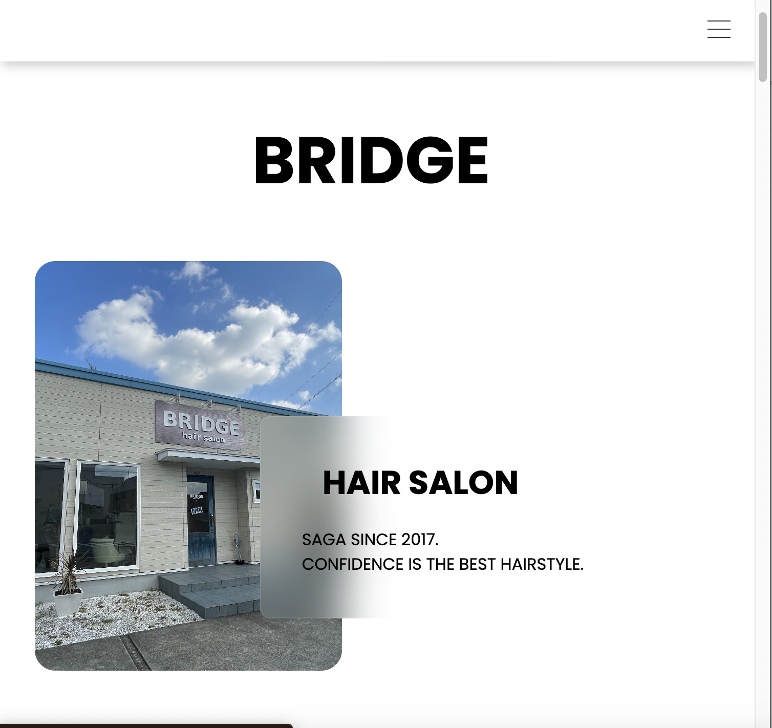 - 鳥栖市にある美容室、"hair salon BRIDGE"私自身も通っている美容室のWebサイト既存のWebサイトが更新されてなく、美容室の顔であるWebサイトを整えたいという思いから、リニューアルを提案し、いWebサイトの改善を決めた。